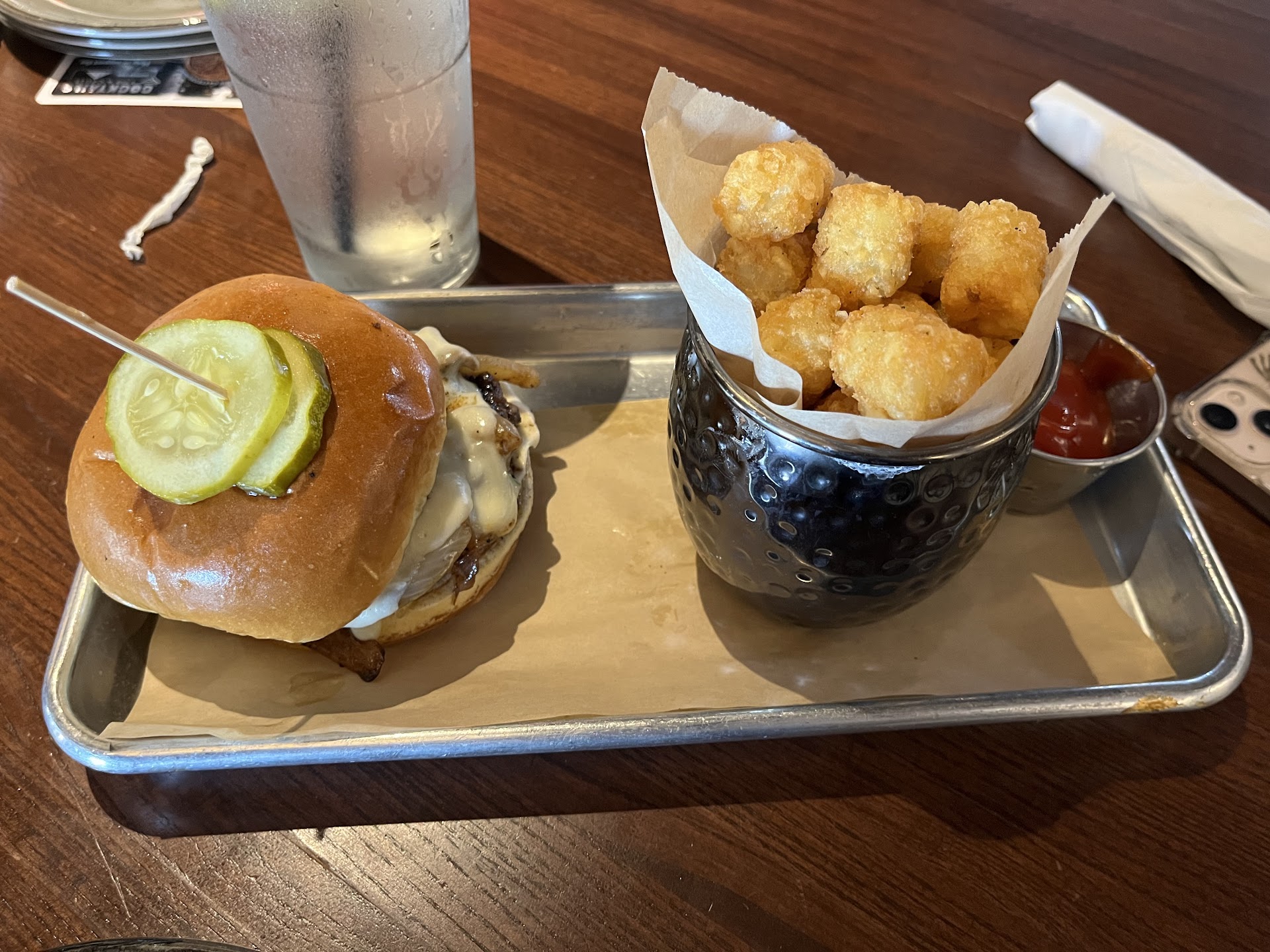 We left after the event but after not seeing anywhere we wanted to eat we decided to go back to Bar Louie since the crowds were gone. We walked in and stood at the door for at least 4 minutes. There was no sign to seat ourselves so we werenât sure. Staff members continually walked past us without saying a word. FINALLY, a woman kindly told us we could seat ourselves. Our waiter came to our table and we ordered the Calamari appetizer and two strawberry margaritas. The SMALL portion of calamari came out and we started eating it. No drinks. Calamari is almost gone, slightly spicy, no water was brought to us and still no drinks- and we did not see our waiter in all this time. The staff we could see were continuously on their phones! I made the comment to my boyfriend saying âThat is literally the eighth employee I have seen on their phoneâŚâ Calamari is now gone and drinks finally arrived. Realizing we may not see the waiter for awhile again, we asked for two waters as well. No problem getting waters, but I guess we are only allowed one straw each for our margaritas- none for the waters. While waiting for our meals, the table next to us had an order of calamari brought out. It was literally TWICE as much as we got- served on a different plate. We realized it was now past 7pm meaning 1/2 price appetizers (Happy Hour) was over. So we paid half-price for HALF an order! Disingenuous! For our entrees I ordered âloaded totsâ with mine ($2 extra), my boyfriend had plain tots. When the meals came out, my boyfriend had more than twice the amount of tater tots as me! Yes, mine were âloadedâ and yummy, but $2 extra for less tots- just toppings⌠Seemed on par for how our visit was going. My Bourbon BBQ burger was cooked properly, but the top of my bun was rock hard, my boyfriendâs top bun was soft. The crispy onion straws on my burger were the outer layer of the onion which is like a paper wrapper- barely even edible. I didnât hear any complaints about my boyfriendâs burger so I can only assume it was good.