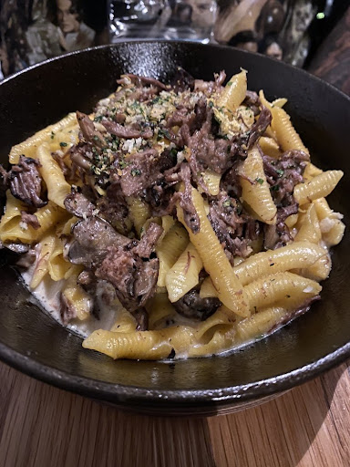 For our entree, I ordered the 16 oz cowboy rib-eye steak with a double side serving of their pork belly mac and cheese. I have to say that I was very impressed with their rib-eye! It was so tender and juicy, you could cut it with a butter knife of how well it was tenderized and cooked. It melted in my mouth as I was eating it. The pork belly mac & cheese was so good as well. I normally love creamier versions of mac & cheese but this didn't disappoint me at all! I was so happy with my food choices! My fiancee ordered the short rib pasta. I took a small bite from it and it was very tasty I must say. He loved it a lot and said it was a great.