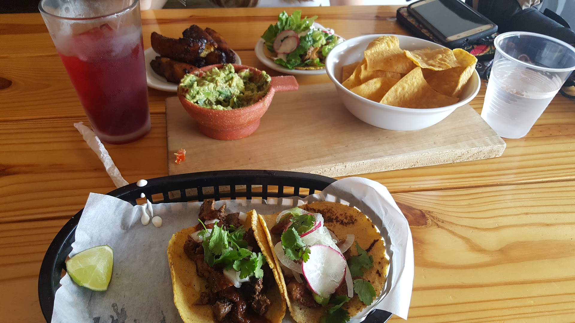 Went there with my fiance for a quick bite. We ordered one drink, 3 tacos (steak, pork fat, and chicken), fried plantains and guacamole.