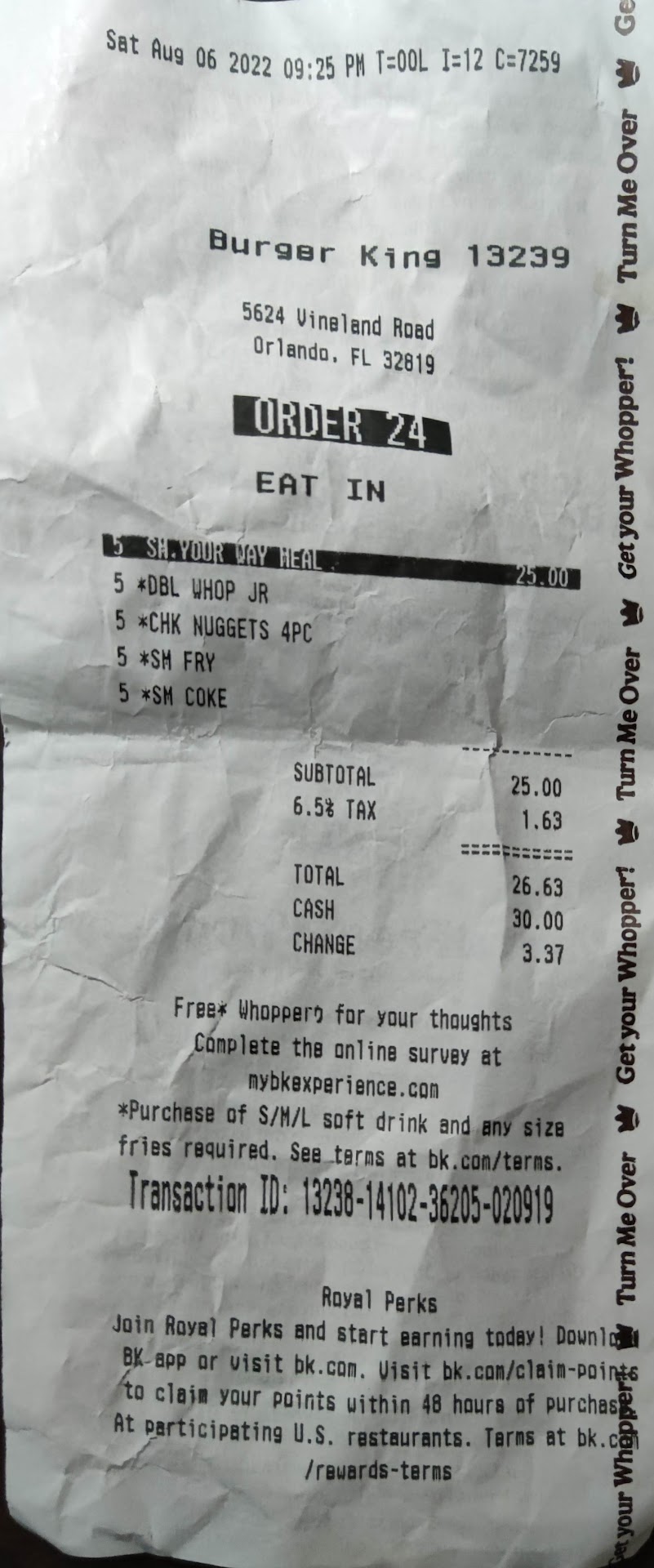 I don’t know what happened to my previous review so I am posting it again. Went through the drive thru, they charged my card without notifying me that they had no receipt paper therefore there was no proof as to what I was paying for so we went inside to get a receipt printed. We were told drive thru and inside ran on two different systems so they weren’t able to print the receipt, we said that was fine to just refund us on our card and we’ll pay cash at the register inside so we could have a receipt. The manager came out and said he didn’t have the access to give refunds. I don’t know what business operates with a manager that can’t give a refund but that was a huge RED FLAG. Not to mention this location is right next to Universal and a lot of hotels, it makes me wonder if they pull that same scheme on tourists who barely speak English and feel like they can’t do anything about it. The managers solution was to take my phone to the back and take a picture of the screen with our order pulled up...That was another RED FLAG and hardly a solution so I said that wasn’t ok with me. He accused me of being racist because he was black and had dreads, like practically yelled it which just showed me that he was waiting for an excuse to use the race card, not that it’s anyones business but I am black and my black father has dreads. When I point that out to him he told me to get out of “his” restaurant. I called the corporate office and explained the situation, they took my information and told me the store manager would be contacting me. No one ever did which is why I’m giving this establishment a poor review. I don’t know what kind of business you are trying to run. The fact that your night time manager was so unprofessional (seriously what “manager” tries to use the race card towards a customer?), not notifying customers that you are unable to give receipts or refunds until after you charge them (I’m pretty sure that you have to have someone there that can give refunds so either he was lying or they are breaking the rules) and when you do have an issue you completely ignore it and neglect to fix the situation or even find out what happened, those reasons alone should tell you to steer clear of this place. There is a Wendy’s and a Mc Donald’s within walking distance and if you really want Burger King there is one in the Publix plaza...