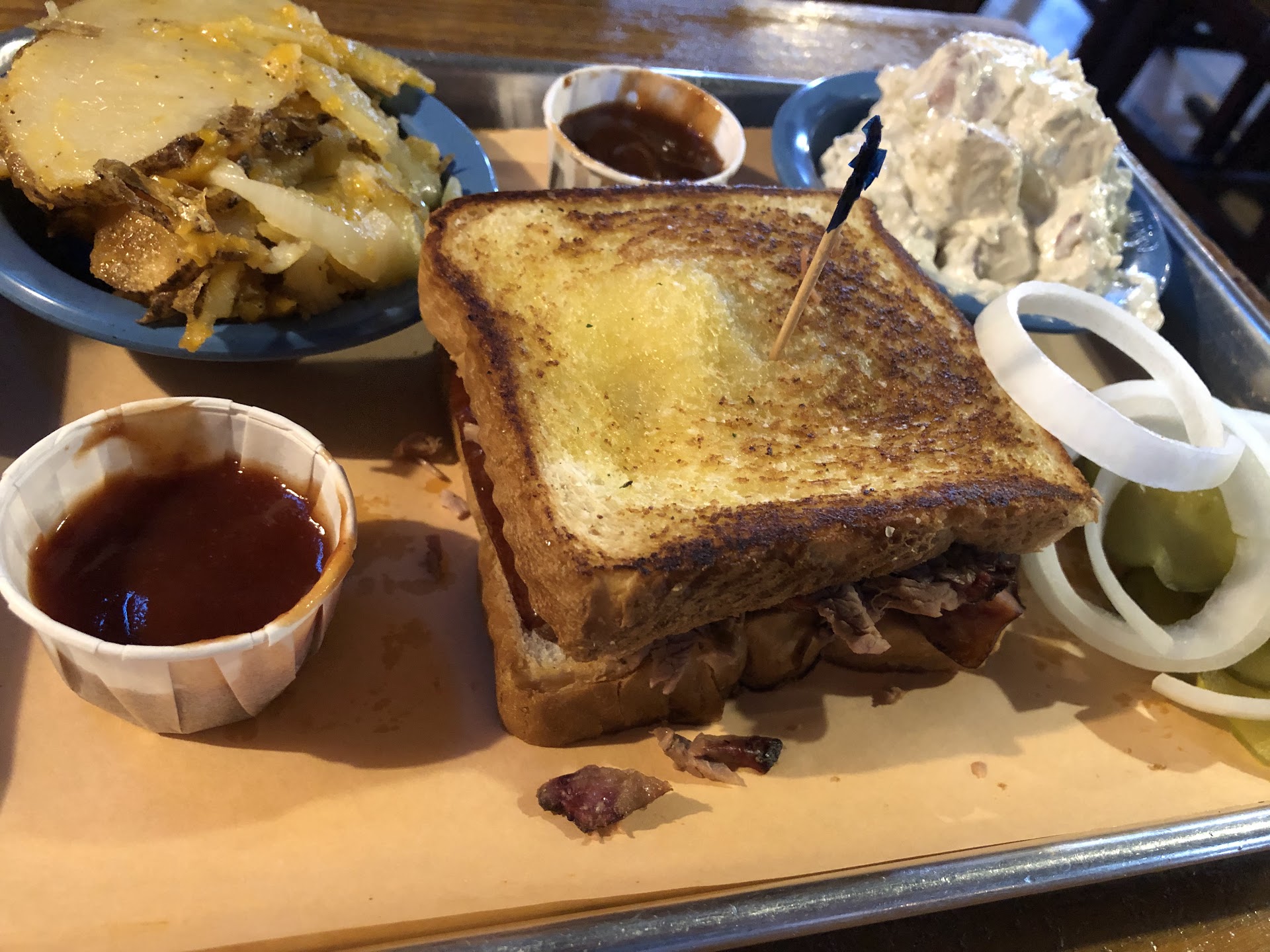 Read moreThank you for THE best Texas style barbecue in Central Florida. Today was our first visit and what a surprise. I ordered the Texan sandwich with choice of two meats and cheese on Texas Toast. I ordered mine with what I consider to be the national meats of Texas - brisket and sausage. Both meats had a nice smoky flavor, not overwhelming but just right. The test for a good Texas meat is when it dies not need to be smothered in sauce and these meats are great on their own. It also wouldn’t be proper Texas barbecue without sliced onions and pickles which are self serve. Side items are self serve and I chose potato salad which was a bit to mayo-y for me but still tasty and chunky. I also chose potato’s sugar tin with onion and cheddar cheese which was really good. My mate ordered the lunch plate and he chose smoked sliced turkey which was nice and flavorful. The sides he chose were jalapeño mashed potatoes which tasted as you would imagine with the taste of jalapeño but again not overly so. His second side was barbecue beans which had a nice flavor and had bits of brisket mixed in. You start your dining experience when you walk in the door with a large menu on the wall. You order your food and they prepare the meats. Once you have your main course you proceed down the line and serve your own sides and desserts as you make your way to the cashier. This wonderful little casual rustic Texas barbecue smokehouse features self seating and offers free self serve soft serve ice cream cones with each meal purchased. The decor is typical of many Texas restaurants and you dine with country music playing and there are large screen TV’s with sports on to watch if you like. The only competition I can see fir this place in its authentic Texas style is probably 4 Rivers but I wouldn’t compare the two. We will be back here again and again and will bring friends and family. It’s probably an hour away from my home but well...