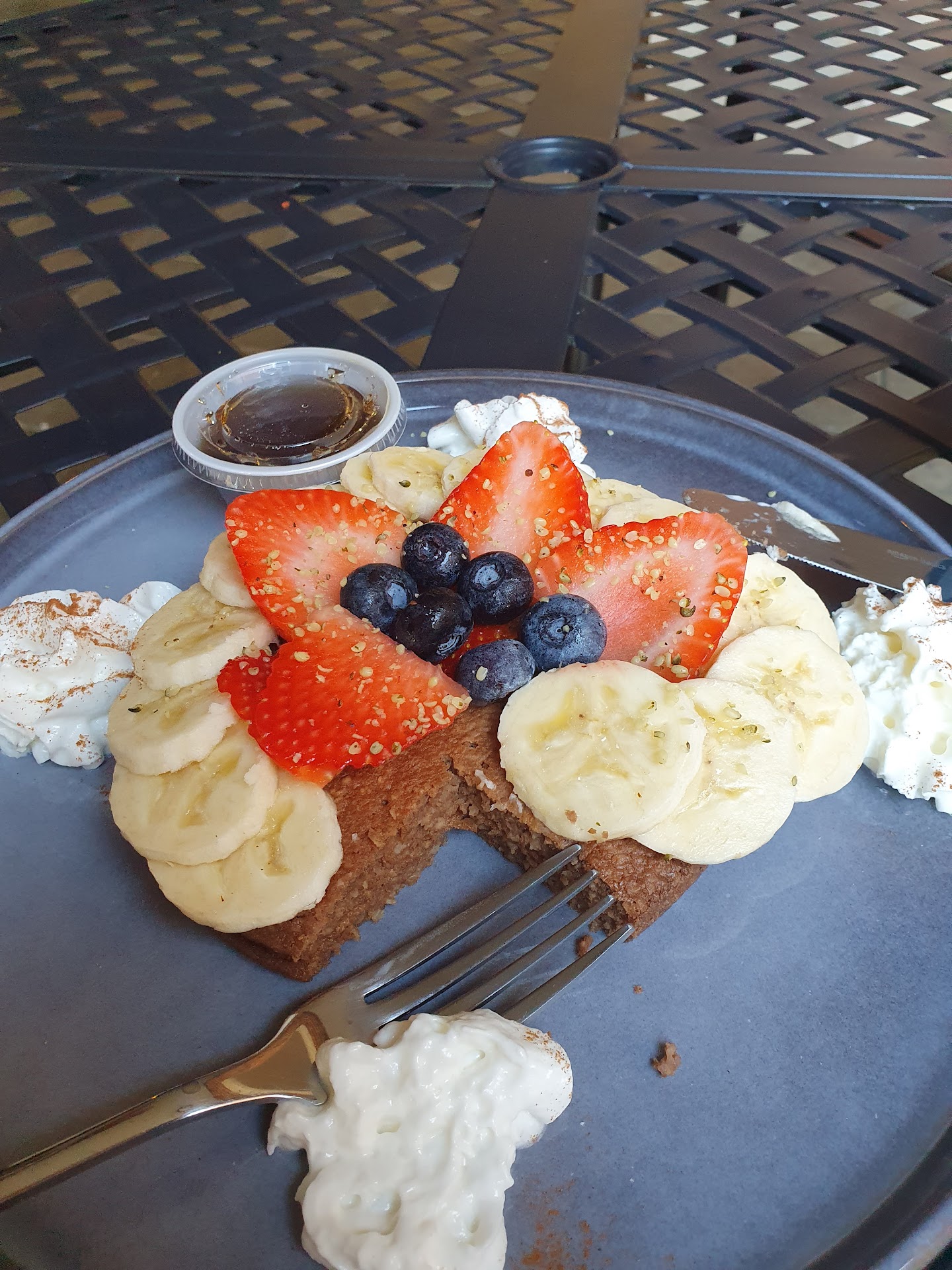 I had the protein pancakes. They honestly were not great, but served as a substantial backdrop to a flourish of bananas, berries, and whipped cream.