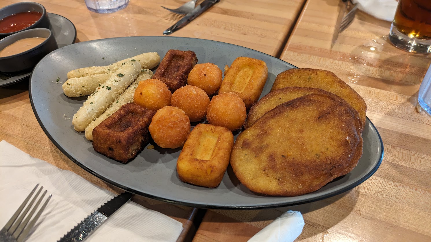 This time we tried the mofongo con camarones al ajillo and the porchetta pernil with rice, beans and maduros. The mofongo was one of the best weâve had. The garlic sauce was not salty and very flavorful. The plantain was moist with chunks of chicharrĂłn and a very generous portion.