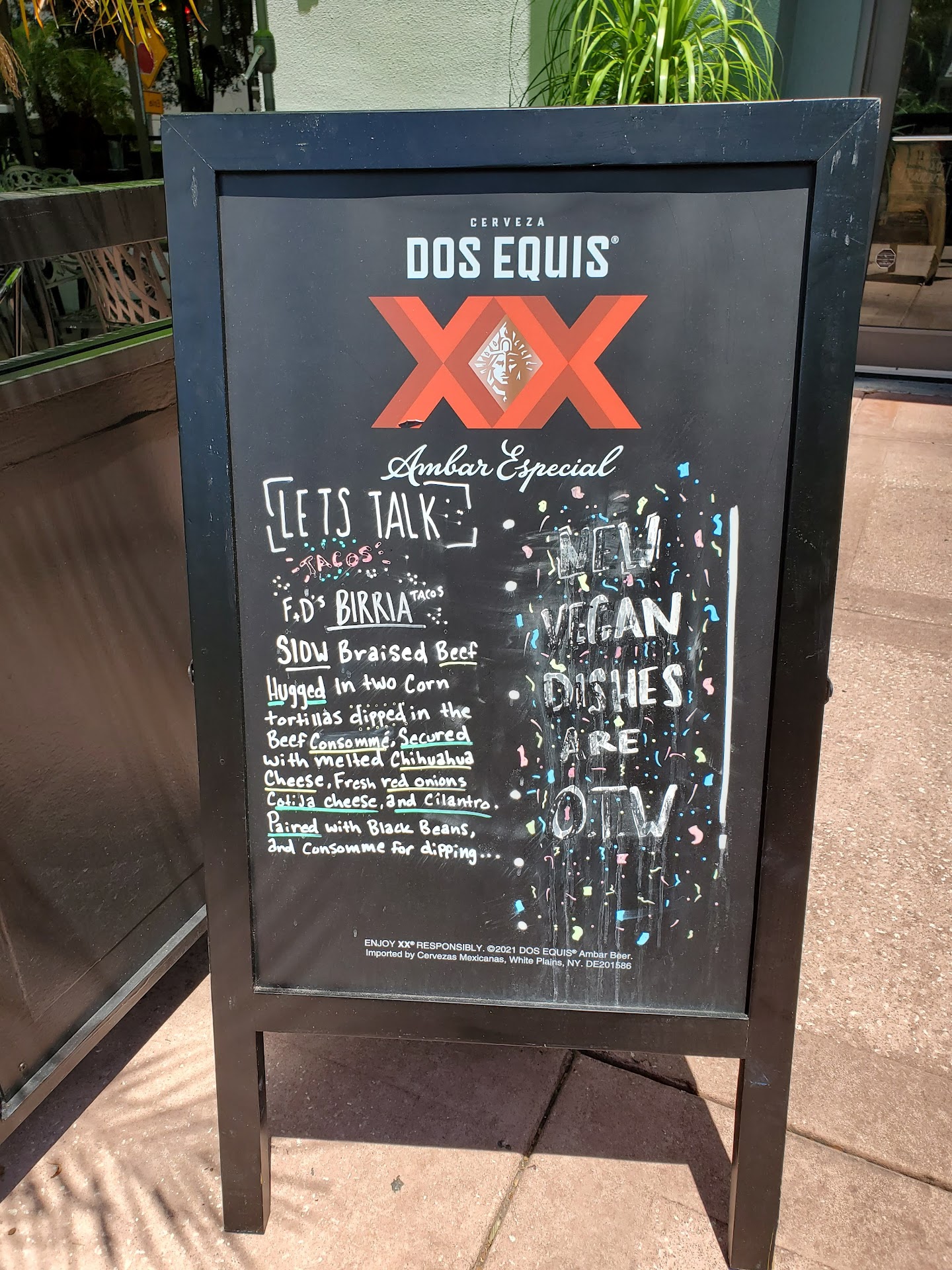 As we walked up, one of the employees took out the board advertising their birria and "New vegan dishes are OTW." I made a mental note and decided that birria was going to be my choice for lunch.
