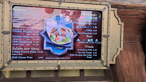 We found this as it was a good price for the portion that you get. We went during peak lunch time so it was extremely crowded. There is an option to mobile order here. We did not as the regular line was short, or so we thought. We ordered all lamb gyro combos with different side options. One member of my party asked a question about what was included in the sides and if it comes with hummus, the employee said yes. So when she picked up her order she noticed there was no hummus and asked for some. That employee told her that her meal did not come with that. She politely explained that the other employee told her it did. The employee told her she was misinformed and refused to give her hummus. A side of hummus that costs them 3 cents, he was so adamant about not resolving the issue. That was disappointing. So then we waited by the pick up as, as did everyone else so it was crowded there. The people calling the orders were nowhere near loud enough. We watched as gyros popped up in the expo window and did not get taken out. The expo window was overflowing in gyros just sitting there and no one was there taking them out to put together orders. We watched as people that ordered after us got their order, and we watched as people that were here before us still hadn’t gotten their order either. We had 3 separate orders and we all ordered one after the other. Our first two orders came out pretty quickly, within 5-7 minutes. However the last order was taking a long time. We waited around 25 minutes more minutes for our order while our other party was eating and basically done. Once we finally received our order, it was wrong, and it was ice cold. We ordered two lamb gyros and we got one lamb and one chicken. We didn’t want to deal with the crowds and the chaos and the employees so we just ate it. It all was good, it was hearty and came with a decent sized portion. We took our gyros just across the way to some outdoor tables. The Madagascar dance party does happen from time to time right there and it is loud so FYI on that. Overall I would recommend this as a unique option that is a departure from traditional theme park food, and it is a good bang for your buck. However, please go on off peak meal times to...