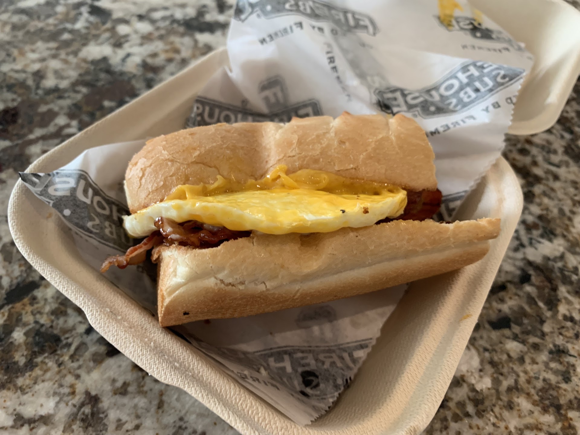 About the food, we got a bacon egg and cheese sandwich for breakfast. We were disappointed by the small portions of the sandwich. For some reason, it had mayonnaise on it. However, the taste of the mayonnaise and the cheddar was good. Much softer than I expect. Overall, there are better places...