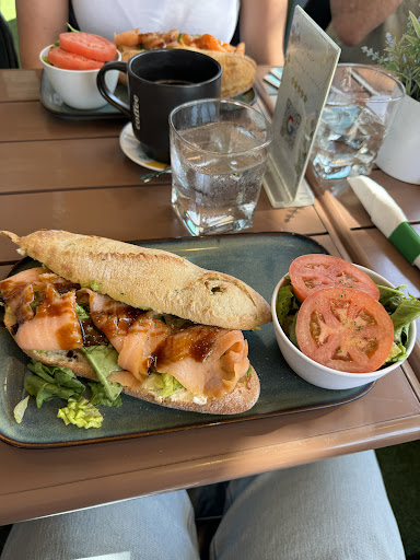 Read moreNo quiche for you! Lunch and a show. We were a group of 8. We sat outside as one person in our party has mobility issues and could not make it to the larger tables upstairs. Our server was very polite, allowing us to move the tables around to accommodate us. The music was a little loud but overall the ambiance was nice. The americano coffees were good but the cappuccino was more of a latte. We ordered a variety of things; pasta, quiche, salmon sandwiches, scrambled eggs, mini baguettes, and an omelet. The quiche came out first and though the flavors were pretty good the topping was dried and did not taste fresh. We sent it back and the server very politely apologized and said he would bring another. While we waited the rest of the food came out. The presentation was great. They all looked wonderful. However, the pasta was bland, the bread was tough, the omelet was supposed to come with tomatoes but didn’t, and the eggs were tasteless. The side salads were tasty though. Now for the best part. A person, I can only assume was the manager, came back out with the quiche (sans side salad) he set it down and said here I warmed this up for you. We thanked him but said that we did not want it. This was not received well and the man, now clearly dealing with some big feelings, explained how the quiche was made yesterday and that is how it has to be done. He only got more heated from there. He went on to say that it was definitely fresh. We said we didn’t want to argue that we were fine we just didn’t want the quiche. He refused to let it go, after going back inside he immediately returned (still enraged) that HE made it and that we didn’t know what we were talking about. Trying to diffuse the situation we all thanked him and said it was all good. However, his rant continued, he finished with a chef’s kiss and went back inside. I will say we were not charged for the quiche or the mini baguettes we never received. As a parting gift the same man came back out to tell us quite pompously that he hoped we enjoyed our meal and that we should definitely come back to experience the love he was trying to pass on through the food and of course the...