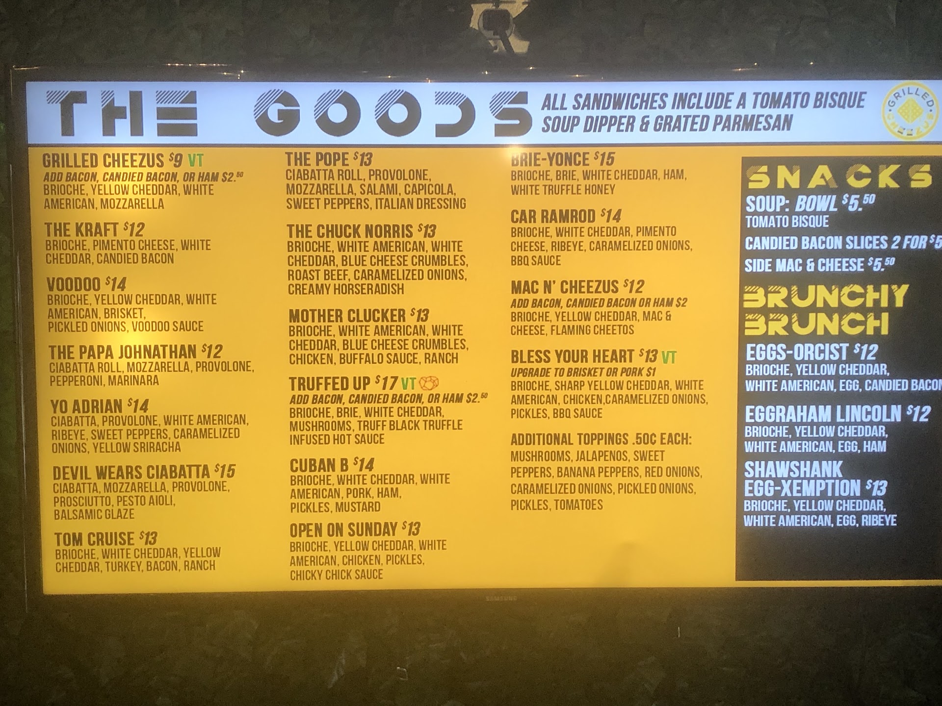 Read moreFirst visit to Grilled Cheezus on Thursday for early dinner. This is a small restaurant with just a few tables inside. We ordered The Kraft ($12)- brioche with pimento cheese, white cheddar and candied bacon - with a bowl of Tomato Soup ($5.50) and The Papa Jonathan ($12)- Ciabatta, mozzarella, provolone, pepperoni and marinara sauce. These awesome grilled cheese sandwiches appeared to be toasted in a Belgian waffle maker as they had the imprint of a waffle and they were nicely toasted all around. The Kraft was super flavorful and incredibly tasty. Even though I’d like to try something else next time, I will likely get this one again. The Papa Jonathan was really like pepperoni pizza in sandwich form. Very tasty also. The tomato soup was perfect, not too acidic and of course paired well with both sandwiches. The Sandwiched come with a dipper portion of soup. We recommend a visit, we think you will be as...