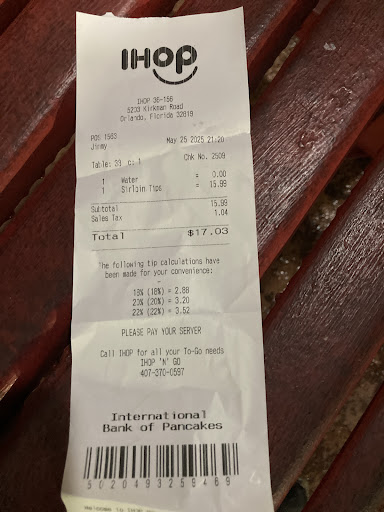 Read moreAbsolutely awful. Waited 30 minutes to get seated (there was only 2 tracks seated at this point). Then waited another 30 minutes for someone to get a drink order. Then another 30 minutes for someone to take a food order. Other people were being seated (parties of 2-4) and being helped. We waited almost an hour to get out our food. My son ordered their fajitas and it was gross. The steak was dry, I ordered the equivalent of a country omelet (which isn't on the menu anymore btw) and it was incorrect. The chicken strips that my daughter got were dry and overcooked. The manager Robert was not pleasant at all. Never apologized for all the things that went wrong. We had to ASK for refills on drinks multiple times. And when we walked out, Robert (manager) just said ok bye to us. Never apologized for any of this mess of a meal or anything. The franchise owner or corporate would not appreciate the poorly run IHOP that this is. They only had 1 server on staff and one in training. Absolutely the worst meal we've ever had at IHOP and the worst service we've received. Not happy and it's 3 hours of our life we'll never get back. We normally have great meals at IHOP but this was horrible. If we had another choice, do not go here, but at 11 pm, our choices were limited. Just don't expect a good meal or service at...