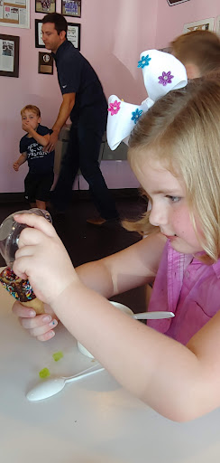 Read moreWe went to Kelly's for a "first day of Kindergarten" after school treat... We weren't the only ones with the after school treat idea, but it was worth the wait! They have absolutely delicious ice-creams to choose from, and chocolate dipped sugar and waffle cones to accompany your choice. We chose Chocolate Raspberry, Key Lime (Pie?), Vanilla with gummy bears and sprinkles, (with a chocolate dipped and sprinkled cone on top!) and Birthday Cake ice-creams. What a delicious treat! Very flavorful and refreshing... And homemade. Delicious! We plan to return to try more flavors. They do have ice-cream to go, including "tacos" and "cup-cakes"... Very tempting! We liked the children's table, and the restroom was clean and well stocked. Our only "complaint" really has nothing to do with the restaurant, instead has to do with just a couple of unsupervised children throwing dominoes and climbing on the children's stools while the others pulled them out from under the climber... not a great idea... while taking mouthfuls of water and spitting them at each other, all the while, water adding to the growing slippery mess on the floor. My five year old was in disbelief, commenting on how they are getting in trouble. Minus that, a...