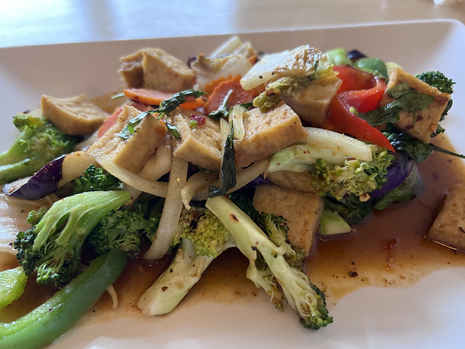 Spicy Eggplant - My absolute favorite. Iāve had both the chicken version and the tofu version. I prefer the tofu version because it lets the eggplant dominate the palate and is extremely tasty with its slightly sweet, yet umami flavor with bursts of Thai basil flavor. Carrots cut perfectly to remain some tooth to the bite. Broccoli, onions cooked but not cooked down. Eggplant has some smokiness from the cook. I crave this dish when Iām not in the area! Sooooo good. Chicken is also good, but I prefer this dish with the tofu. Medium is a good spice level for people who like a little warming spice. Not uncomfortable. Serving size is generous. I like that there is enough rice to go with the portions.