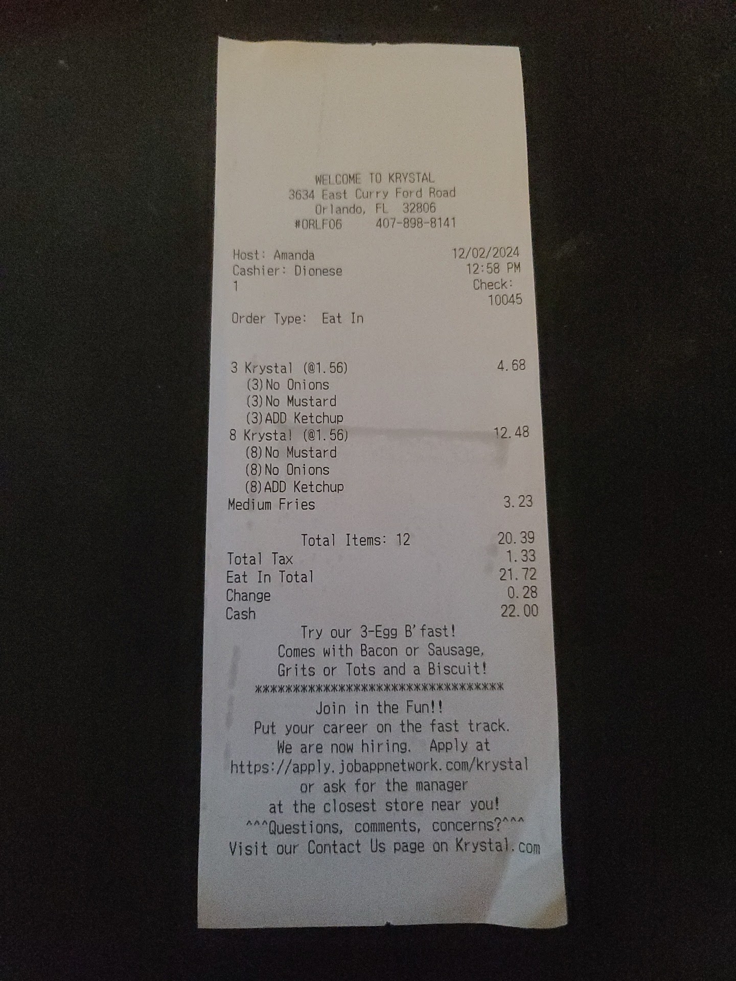 This has to be the absolute WORST Krystals on the planet. 1st, I'm the only person there, no one inside or drive-thru. I made my order, 8 Krystals no onion or pickle, ketchup and mustard only and medium fry. Then she tells me $21 and change, I said WHAT!!!! When did Krystals go gourmet? That's outrageous. Turned out, it was $16 and change, she did 11 instead of 8, ( I don't know) lol. The Manger gave me back $5. Remember, only me there now and still. ALL my burgers had onions all over them, had the pickle and ketchup, NO mustard WTF. The fries were not hot whatsoever. As I started cleaning off my burgers a couple people came in waited for ever and 2 left and another couple came in, they finally take the 1st couples order, that other couple left. Then I noticed a gray car go in the drive-thru, heard them order, then pulled around and they had them park, 20 - 30 minutes went by I finished eating, that car was still parked. I was leaving, the girl inside said something to the girls in that car, I went back in to throw something away, I asked, ase yall waiting on an order? She laughed and said yeah, OMG they were there forever. I said good luck and left. I will never go back to this one ever again. They need cooperate to come in and get rid of everyone and hire people who know what they are doing and who care. As far as the prices now, NO WAY, they have lost their minds, they are stupid expensive for their tiny food. You can get full burgers for the same prices almost...