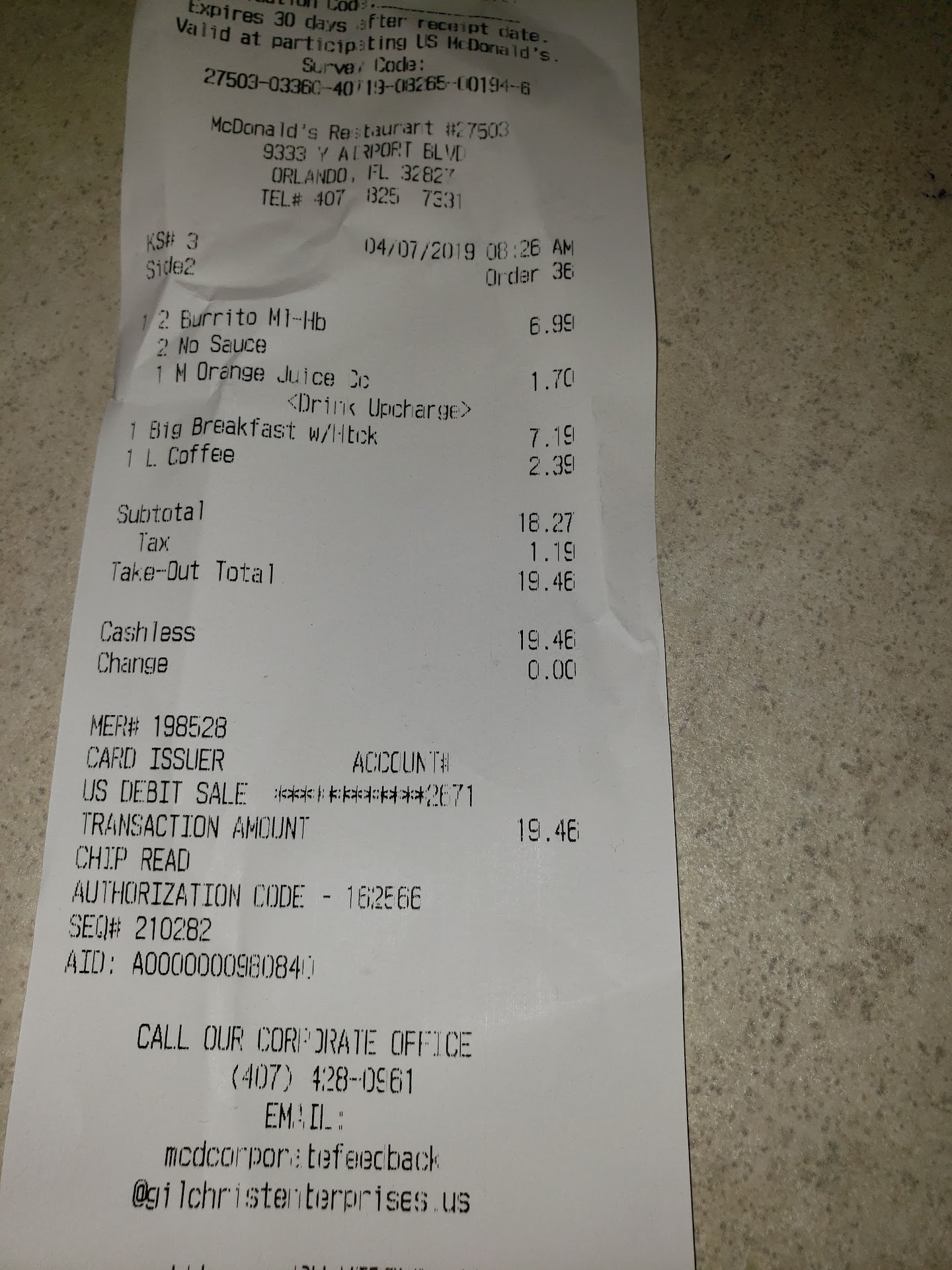Read moreI wish to start this off by saying I work at McDonald’s. I usually work front counter, and I make mistakes- however, when I ordered a medium iced coffee, the person taking my order clarified “a medium iced coffee?” I said yes, medium iced coffee, and lo and behold, when I get our order, it’s a regular coffee. I am usually pretty understanding of mistakes, it’s a busy place, it was loud, but they had asked if I wanted an iced coffee, and then proceeded to give me the opposite of an iced coffee. Not only that but the sausage burritos I got were messy- I’m used to one end being open from the restaurant I work at, you just hold it by the other end and all is good- but I couldn’t because it was covered in cheese! I couldn’t complain and ask for the iced coffee I ordered, because they hadn’t put it in as iced coffee! I’m very...