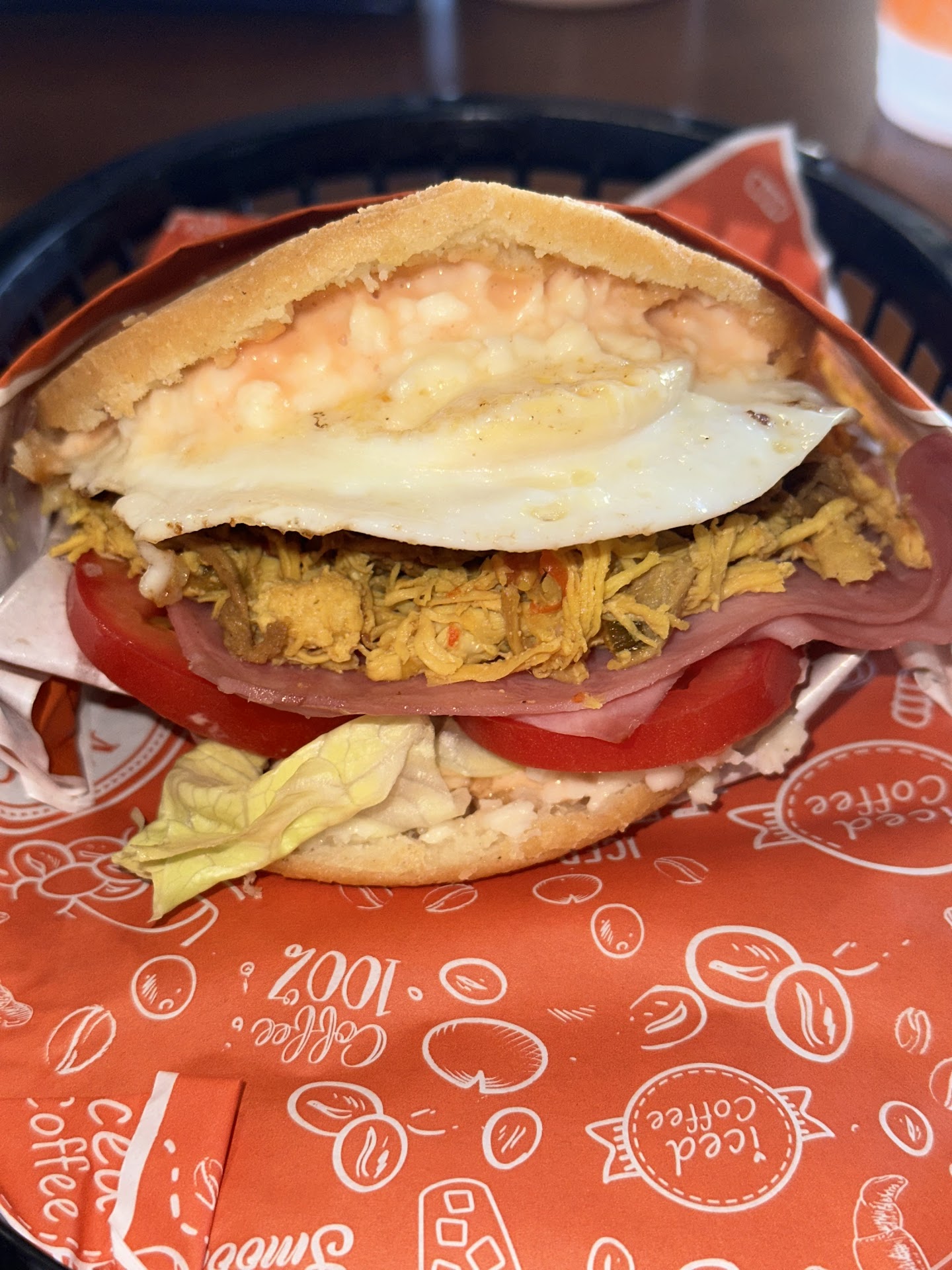 One of my favorite Colombian places in central Florida now. Let me get this on point, this place offers a fresh hand made food. Almost 90% of their menu it’s created at the moment, so be prepared to wait a few minutes to have the experience. They have different styles of coffee’s, they offer the option to order online and pick up which is really great for people who commute or just pass by. They have Wi-Fi for guest, plenty of chairs, tables and parking. For you to have an idea this is where Dunkin Donuts was at Kirkman Road. Look the picture which is an Arepa filled with scrambled eggs and ham.