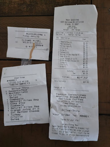 We go here all of the time because they are across the street. The food is hit or miss but today will be our last time. We ordered on the ap and paid $53.50 when we checked out. However it doubled everything and charged $107. We went inside and told them what happened. The young lady got the manager Hector and he did not speak any English. I had a friend that spoke Spanish and explained the issue. The manager Hector said there was nothing he can do we did on there app through corporate. Corporate is closed on weekends. No big deal we asked he fix it Monday and follow up he said they will not do that it is our problem and we need to call and deal with corporate. I said that’s not right and we come in all the time. His response was I don’t care don’t come back. All of this was in Spanish. How do you have a manager that does not speak English in Lake Nona? and what kind of service is this? We were in another time and none of the staff spoke English and I said I don’t speak English and the woman shrugged at me. I will never go back and if you do not speak Spanish you should not go here. Not to mention the very poor service from the manager Hector who pointed out “I’m the manager Hector, don’t come back”. All we asked is they fix it and follow up. Crazy when we got home one of the sandwiches was not even right. But no point in going...