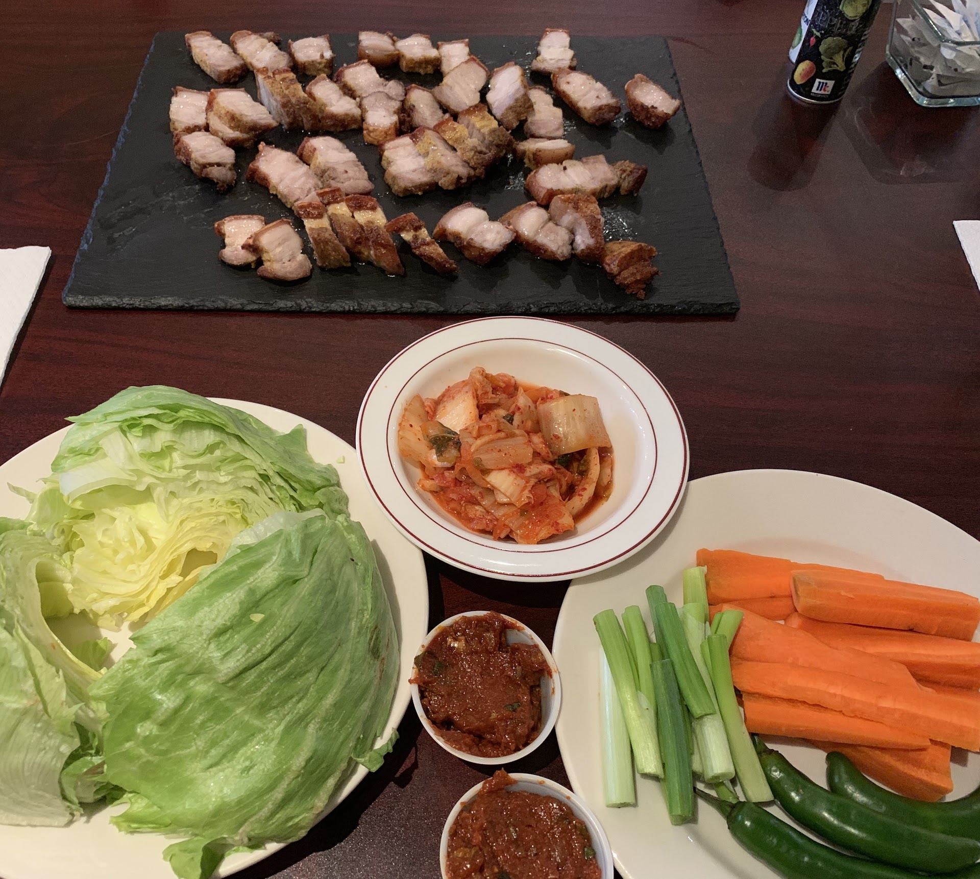 So I chose this place for date night because I had a coupon (I’m cheap) and I was searching the menu, but I’m also a visual person, so I looked through the photos. I saw the Pork Belly where you have to call an hour in advance, so I called, not knowing what to expect since it’s not on the menu and didn’t have a price. We arrived and John knew my name as soon as we walked in! They treated us like royalty from there on out. I grabbed a Soju and hubby was driving, so he just got a Hite from the drink cooler. John dang me up and it was almost $80. I tried not to show my pain, and even gave a tip. We sat down and immediately received the Soju and Banchaan. Soon after, the Pork Belly was presented on a beautiful board.