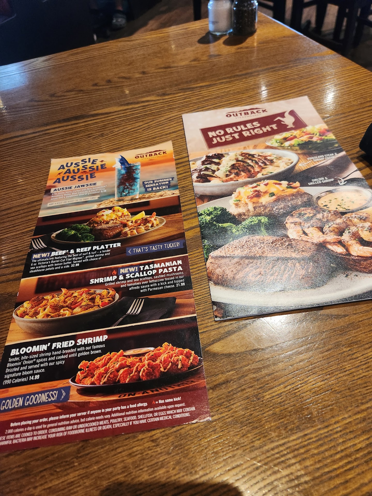 Read moreI love Outback, but my experiences at this location has been less than stellar. To-go service here leaves a lot to be desired. This last visit was the final straw for me. Ordered 2 Four Course Meals, only to get home and realize I got 2 Two Course Meals (missing the soups ans desserts and also the bread) Call the store and ask to speak to a manager, was put on hold for 15 minutes. By this time I had driven back to the store, when I pulled in the parking lot someone answered the line but it wasn't the manager, put back on hold. Walk in, get the rest of my food, wait to speak to manager, he is in the same room(the to-go area) as myself and on the phone with another customer. I wait he gets off the phone and starts to walk into the kitchen area, when the to go server tells him that I was waiting to speak to him. The manager walks past me and goes back on the phone. That really upset me, so I said a few choice words and left.