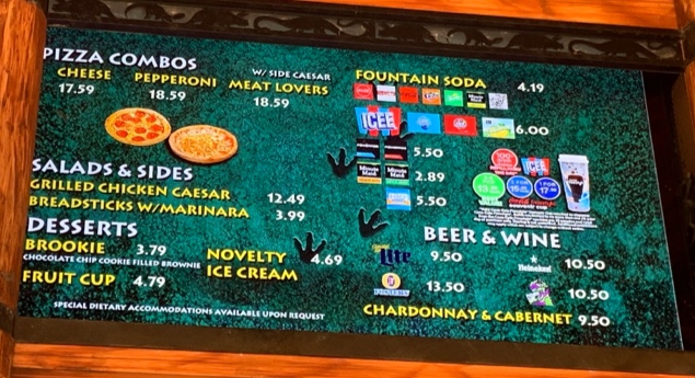 As far as theme park food goes, their pizza is pretty decent. The breadsticks are delicious. But, of course you are paying theme park prices. Your given the choice between 3 combos which include what is about a 10" pizza (cheese, pepperoni, or meatlover), and a small salad. Breadsticks and deserts are also available. So, is it worth the price? The cheese combo will run you just about $18 after tax, and if you want breadsticks, those are about $4 for two sticks and a very small cup of sauce.
