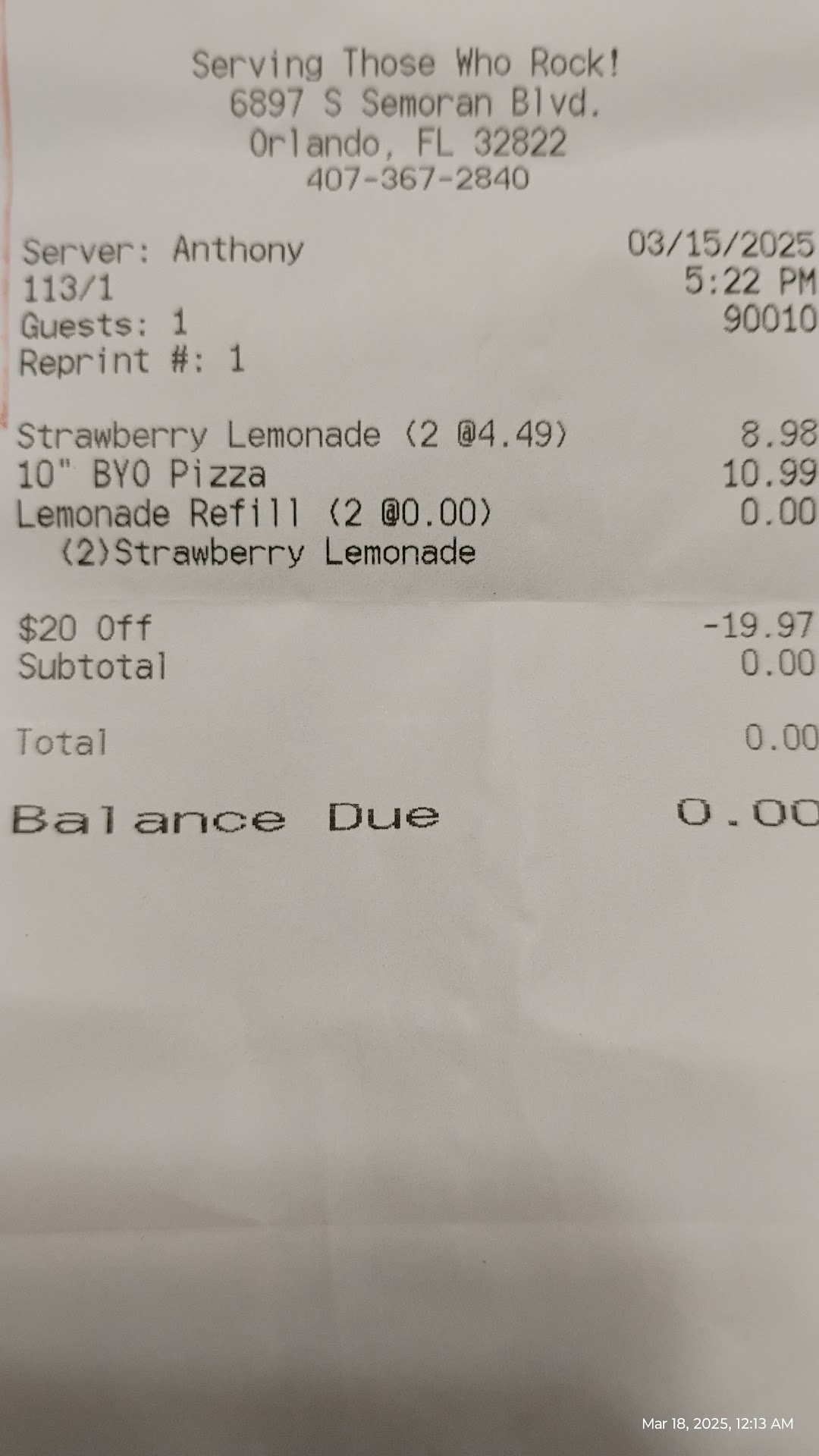 We are regulars at the Kissimmee location to the point that we get discount coupons emailed. Last Saturday, we were in Orlando and we had an early breakfast, but already had dinner planned. So I decided to go to the Orlando location, everything looked very familiar to our Kissimmee location, so we went to the outside area and sat at a table. A couple of minutes later, the server shows up and introduces himself as Anthony. We already knew we wanted the cheese pizza and two strawberry lemonades and told him so. It took the normal time and was brought from the back fresh and hot. When we were ready to pay, I told Anthony that I had a promo that required me to redeem it in front of a staff member, I proceeded to do so, and it showed a $20 off code with a timer of 4:00 minutes. He looked at it, didn't even note the code and said: "I'll be back with you in a minute" He then goes over to the bar and starts pouring drinks, getting food for other customers and everything, except taking care of my winding down promo. When he finally showed up,the clock had expired over 10 minutes ago (making the total wait time close to 15 minutes). I had to call for a manager to fix this situation and when the manager told him, he immediately changed his look and gave us attitude. He still takes time to fix his mess, then sends another employee to ask me if it was a 20% discount code. I told him it was a $20 discount and that I redeemed it in front of Anthony. Then, another 5 minutes later, he comes to the table with a new receipt zeroed out. And with his ridiculous attitude told us, "have a blessed night". Obviously, wishing for the opposite. We will NEVER go back to this location and won't recommend it to friends based on his actions. We will stay with the Kissimmee location, where everyone is ALWAYS a...