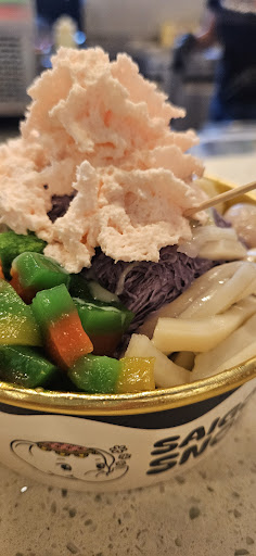 Saigon Snow offers 4 fun flavors" mango, ube, pandan and strawberry with 2 optional fruits. The serving includes green cake with crumbles, rainbow mochi and topped with whipped cream.