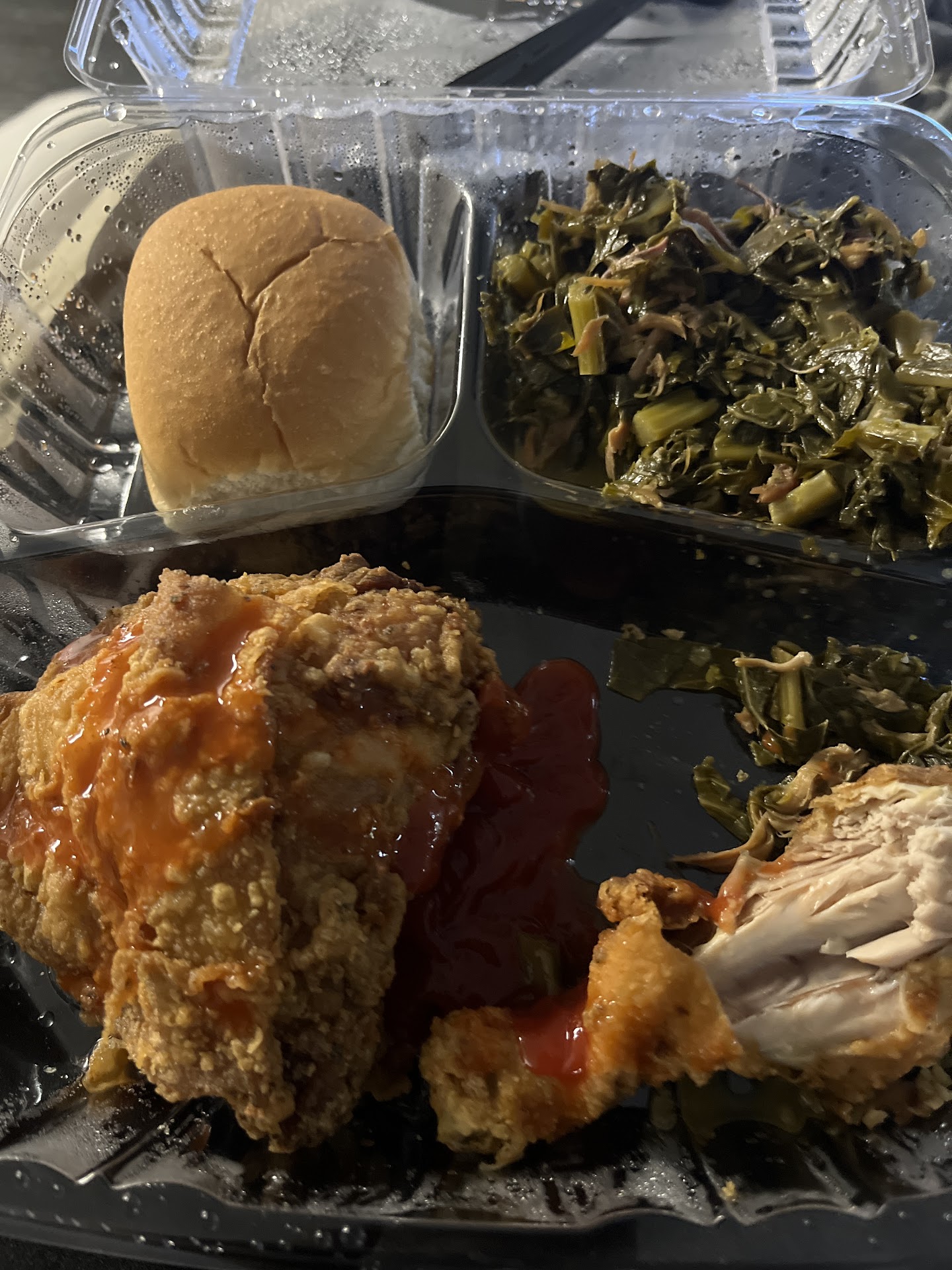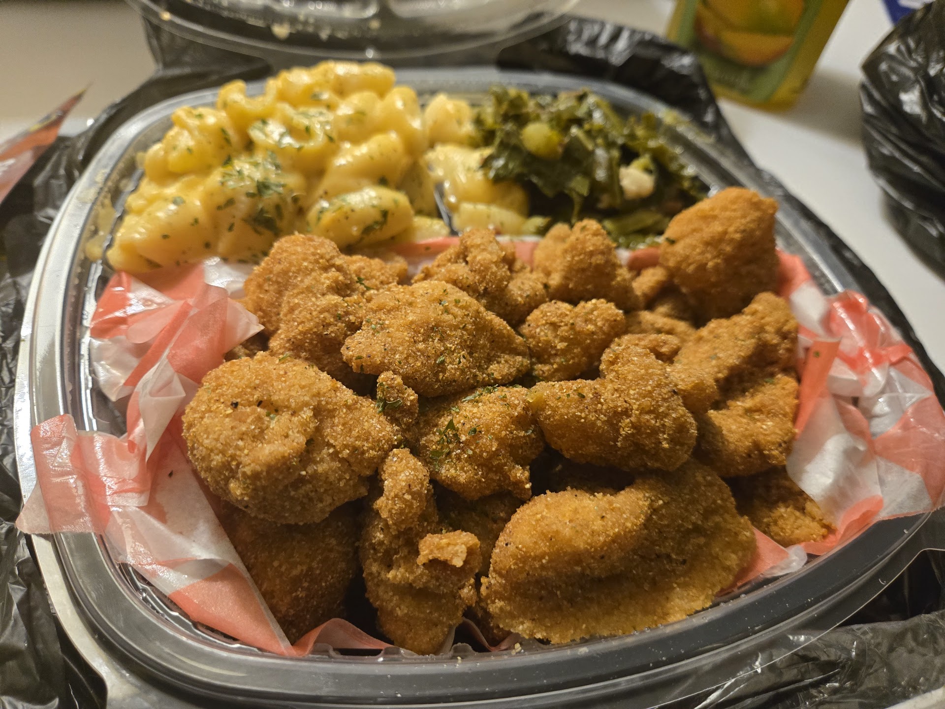 I ordered here through Door Dash it wasn't bad I got 2 platters the 4pc fried chicken with yams ,Mac and cheese and collard greens. So I rate the food 4stars because I know this isn't yall fault but I wish they could make a special container where the chicken won't get soggy it wasnt horrible it still had a little crunch but very minimal the seasoning on the chicken was perfection like wow amazing šš¾ the collards were perfect not too salty just right. The yams at 1st bite had a weird taste like I could taste the condensation Milk which I didn't like but it still wasn't bad after I got use to it. The Mac and cheese wasn't bad again it had a weird flavor at 1st biting into it like a smokey bacon flavor type of taste but I got use to it im just not use to my Mac and cheese tasting like that. Would I order here again Maybe it was worth the try thats for sure and yall get a pass for being soul food I got sleepy after eating...