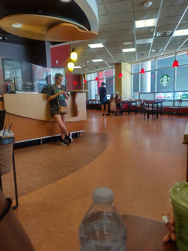 This Starbucks is pretty good. They have all the expected items. There are plenty of seats and they are hardly ever all taken. Most people grab a coffee and walk. They had coffee cups holders for the carts for like a month, but they all got taken or not returned and now those are gone.