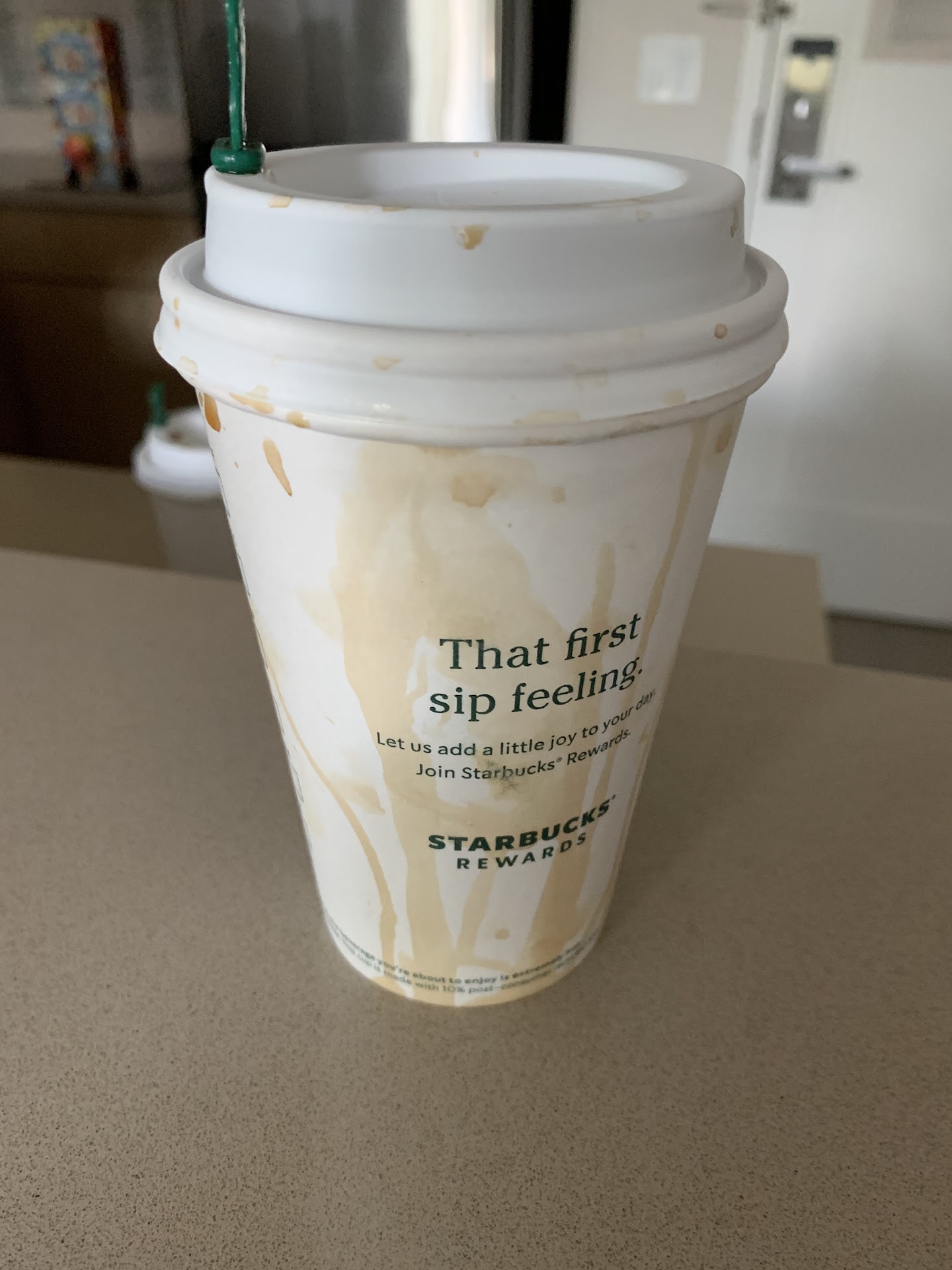 Read moreMy husband and I travel for work, and we’ve been in Orlando for about 2 weeks. Naturally we have come to this Starbucks almost every day for 2 weeks. Apparently they are out of coffee sleeves (no problem at all) but they’ve been doubling up on cups to compensate. Since doing that, our coffee leaks nonstop as the outer cup warps the inner one, causing the lid to not fit right.