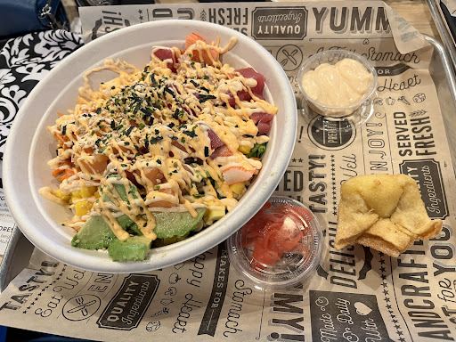 Enough about the avocado; we got the avocado! But on the small bowl order, which was only: white rice, spicy krab, shrimp tempura, cucumber, scallions, purple cabbage, sweet potato flakes, and ginger... I also got jalapenos?