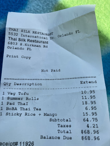Heights of bad experience: I am not from Orlando so I was googling for thai places for dinner. There were two popped up for that area. Red Bamboo and Thai silk. Red Bamboo entree were half the price from Thai silk so I picked Red bamboo looking at their reviews. I called and the person did not greet with the place so I placed the order and went to pick up. Order was for Pad Se-ew( My fav thai dish) and medium green curry and salad. I went to pick up the order looking for Red bamboo but the address took me to Thai Silk and when I looked at the bill it was exactly double than what I expected. I tried talking to the waitress but she just ignored what I was saying and told me red bamboo is bought by Thai silk owner but then I told her about active website for red bamboo but with no consideration she charged my card and I picked up my food and came to hotel. My Pad se-ew wide noodles were not cooked good and I do not eat pork and the dish was smelling all pork and beef. My green curry was so spicy that I could only had 2 spoons of rice. So I went back to the store; the closing time was 10.00pm and I fot there at 9.45 pm. The front door had closed sign on. My husband and I tried to wave inside they saw us and hid behind the wall( Really!! I thought they did not see us but indeed they did see us). I was persistent for $$$ I spent so the guy had to open the door and he started looking at the food. I told him that curry is Extra hot and he opened up rice and told me i had two spoons of rice though( I could not believe this!!) Heights of bad service. I asked for manager number. He did not give me any number and asked me to call back. Food business people should be happy to cater customer's needs and not give this...