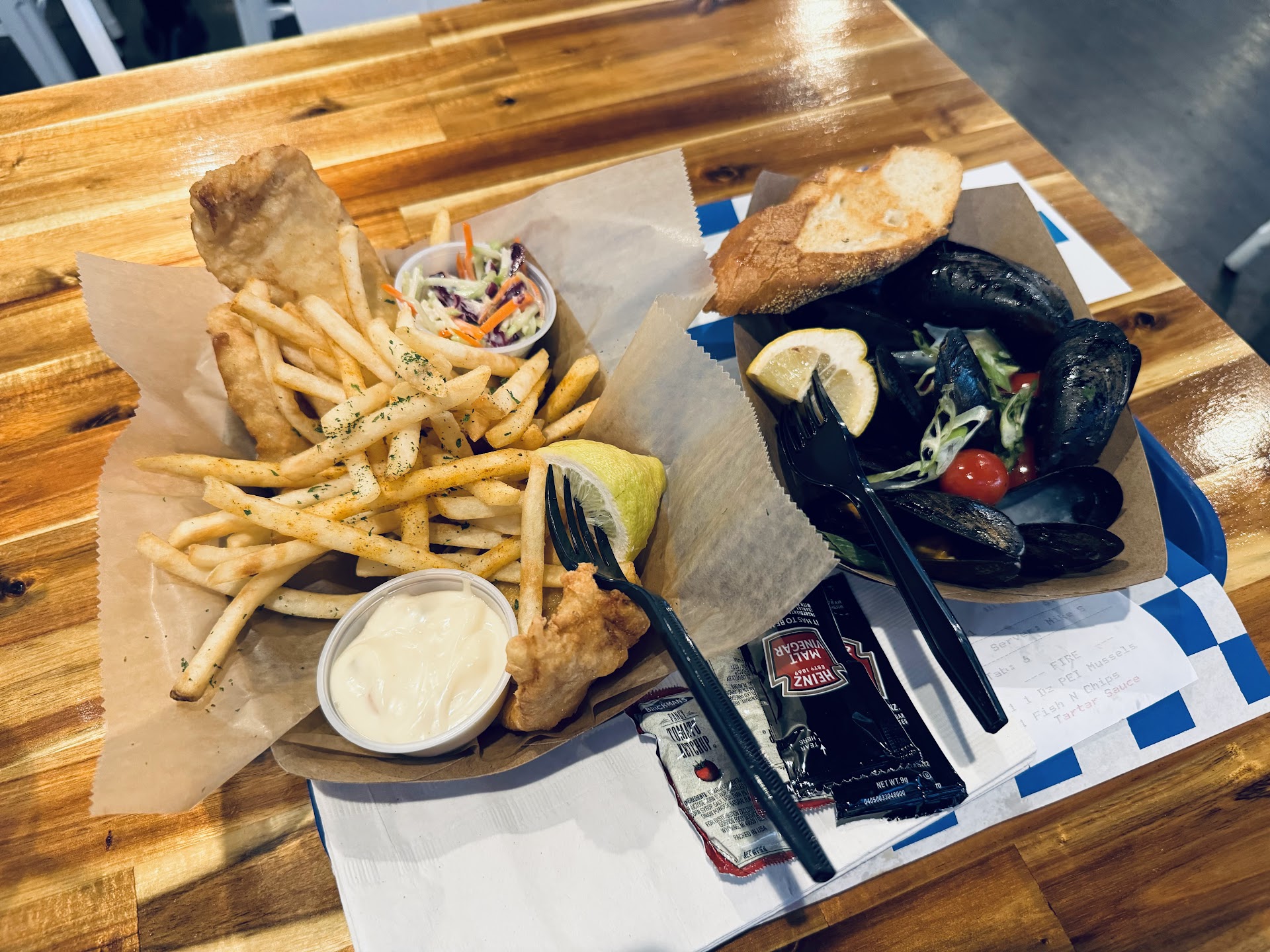 It was a mixed experience but let’s start with the good stuff: excellent impeccable service, clean and comfortable dining environment. The staff were very friendly and frequently came by to check in on the diners. Food also was not a long wait, served after 10 mins despite it being a Sat evening. However, the fish & chips I ordered was quite disappointing, and is the reason otherwise this would have been a great dinner. I love F&C, having lived in the UK for a good number of years. But this by far was really one of the least memorable encounters of the dish. There was little batter and there was zero crisp to it. Look at the photos and you can tell. The tartare sauce that came with it (charged at $0.30?!) was of the miserably cheap quality. I don’t mind paying for tartare sauce - though it should come with the dish like a wedge of lemon - but at least give some decent quality sauce? Also, the side of coleslaw was of a miserably stingy portion and was rather bland. What made the dish even more miserable was how it was served on a disposable paper tray with disposable cutlery, fries dumped right on top. Like what another reviewer wrote, I barely had space from the tiny tray to eat comfortably. Also, once I was midway through my meal and had finished the fish on one side, the tray tipped upwards due to the unbalanced weight of the food, and this kept happening as I would stop to move the food from one side of the tray to the middle to balance it. Not great indeed. On the other hand, the mussels were really good. The sauce was incredible, one of the most unique and best I have had in a while, and it was garnished with delicately sliced chives with a dash of alcohol that gave it the right amount of kick. The total bill came up to ~$40: fish & chips, mussels and refillable iced tea. Quite overpriced for unappetizing fish and chips served on a paper tray with disposable cutlery and cheap...