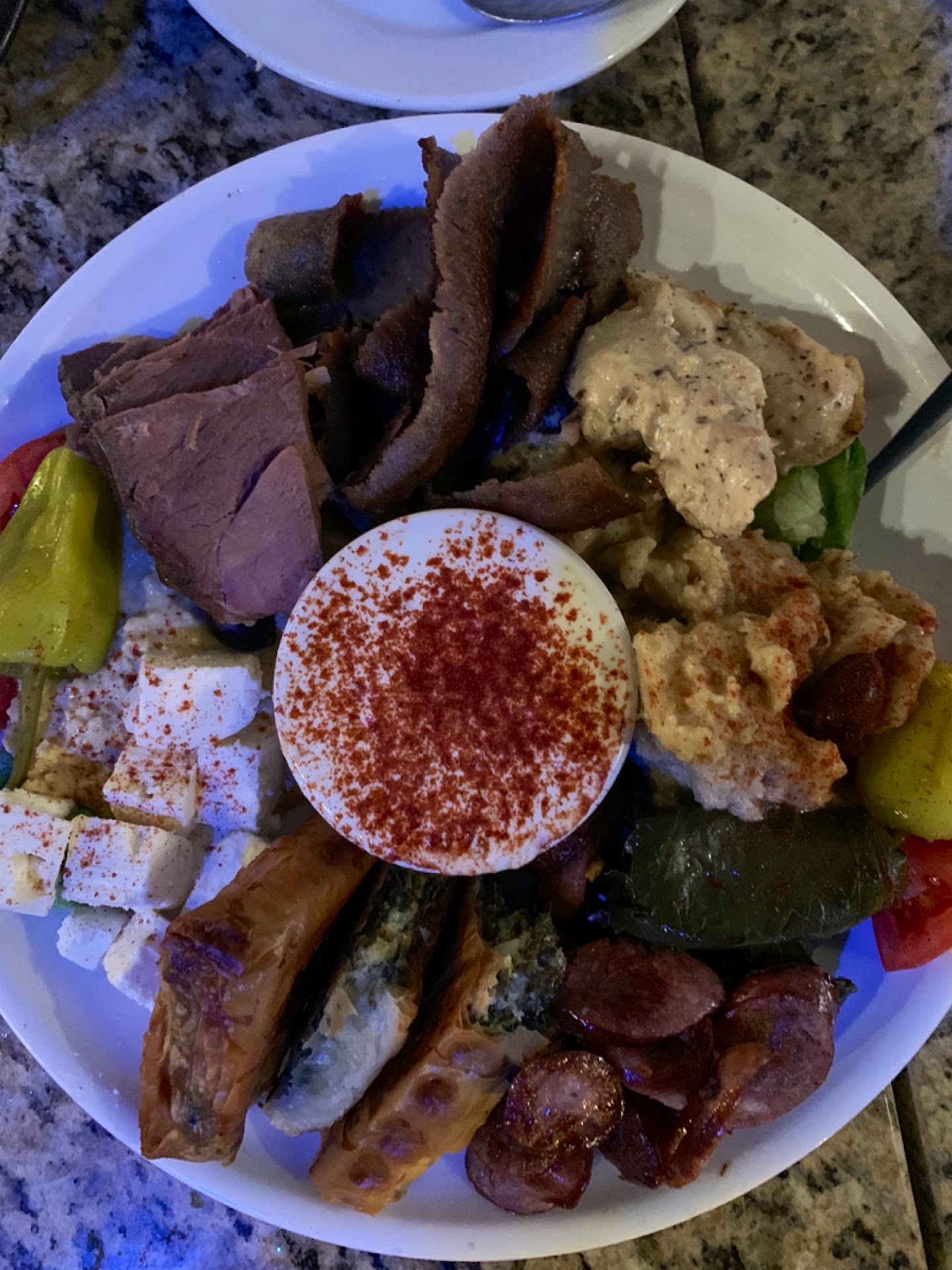 The appetizer was good but very salty. It came out plated on some very, very wilted lettuce with an old looking black olive. The gyro’s were dry with barely any meat inside it. It was warm meat but a cold grilled pita (if it’s grilled how the heck does it come out cold?) and the fries were way over cooked and some were even burned and inedible.