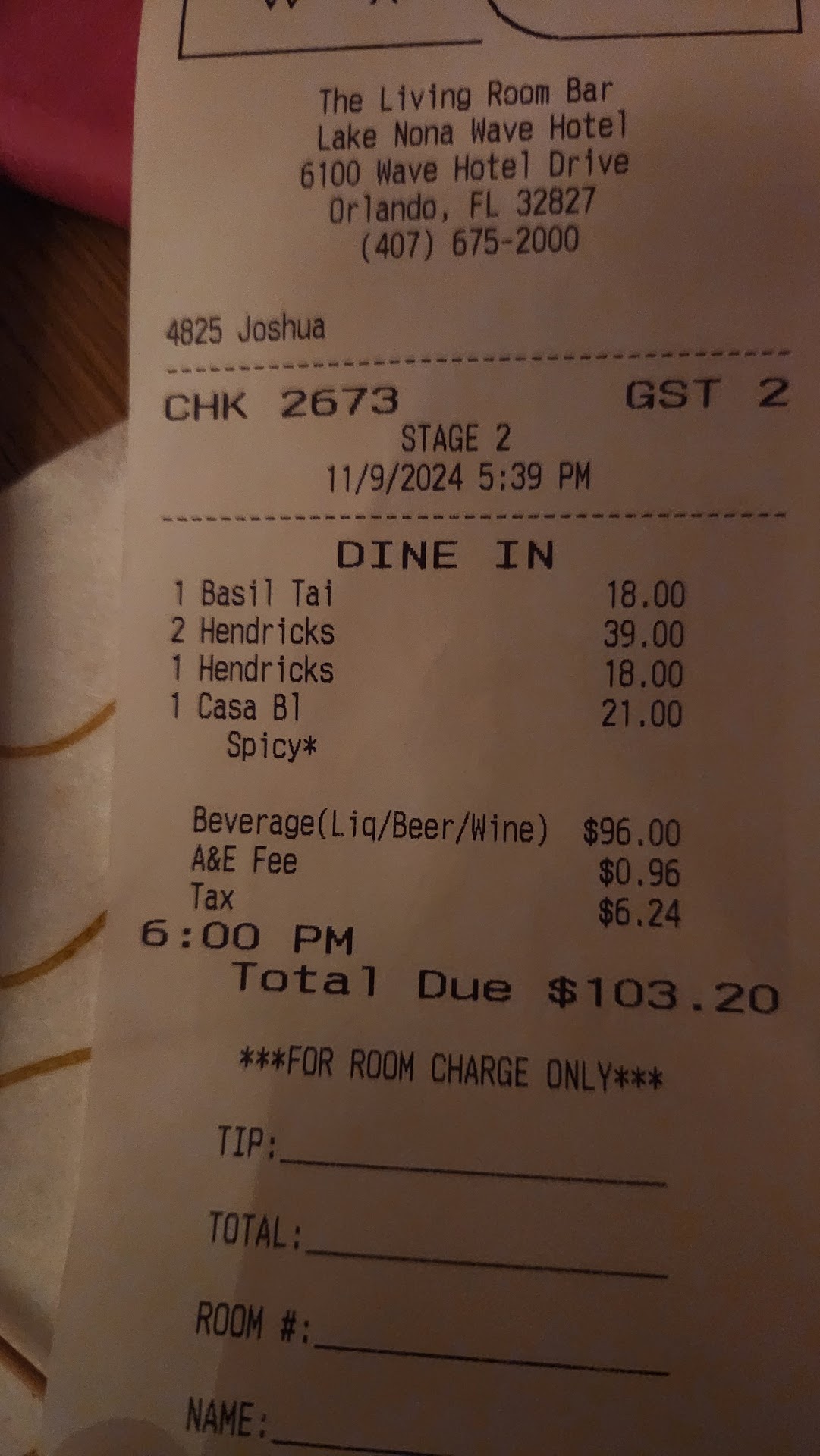 We came in dressed like what we are—normal Lake Nona residents. Not underdressed, not sloppy, just casual. And somehow, that made us invisible. We waited over 30 minutes while the bartender stared right at us and didn’t approach. Had to repeat our order four times: a double Titos & soda, double gin & soda, and a Cosmo—which ended up costing over $100, with no clear communication or care.