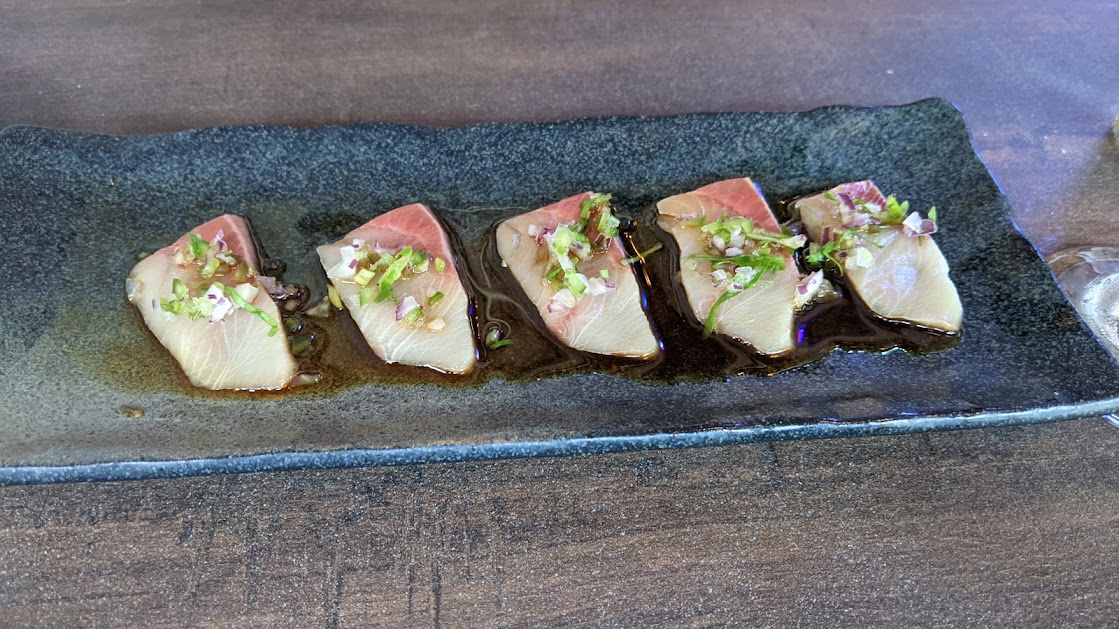 Course 1: Yellowtail Sorreno (thin sliced yellowtail, jalapeno, cilantro, onion, yuzu). This was great. The tuna tasted nice and fresh and the little minced pieces of stuff on top really complimented the fresh fish very well, especially that tiny little zing from the jalapeno.
