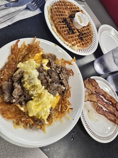 Read moreOur family had never been to a Waffle House before, so we were excited to try it out! Walking into the building at this location, we were shocked about how small it was-it didnât help that half of the seating was taped off and unused. There was only 1 available seating booth, so our family got lucky that we didnât have to wait to eat (we went around opening time). The waitress that we were assigned was really pleasant and respectful. She handed us the menus and got us our initial drinks. Yeah, personally, I was disappointed that the Waffle House wasnât a mountain of waffles that had crazy and wacky toppings (or at least a waffle bar), but thatâs just me and my imagination! The food was good! It kind of reminded our family of Perkins or Dennys based on the type of food and the style of the restaurant. I ordered the sandwich with bacon, cheese, and eggs, all between two slices of lightly toasted bread. It was really good! The hashbrowns that I was served were a little grainy and soggy. Iâm not sure how to describe it, and it could just be how Waffle House does their hash browns, but I wasnât too fond of them. I would say, itâs par for breakfast. I would definitely order the sandwich again! And I would visit another Waffle House with my family. But, would I come back to this location? Probably not, because itâs cramped and thereâs not really any seating options or space. And we were right next to where the food was being cooked, so everything just kind of felt unclean. Not only that, something broke and water started spraying near the bar area. It was a mess. The floors were a bit dirty, and most of the surfaces had some type of mark or grime on them. Overall, not the worst, not the best.
