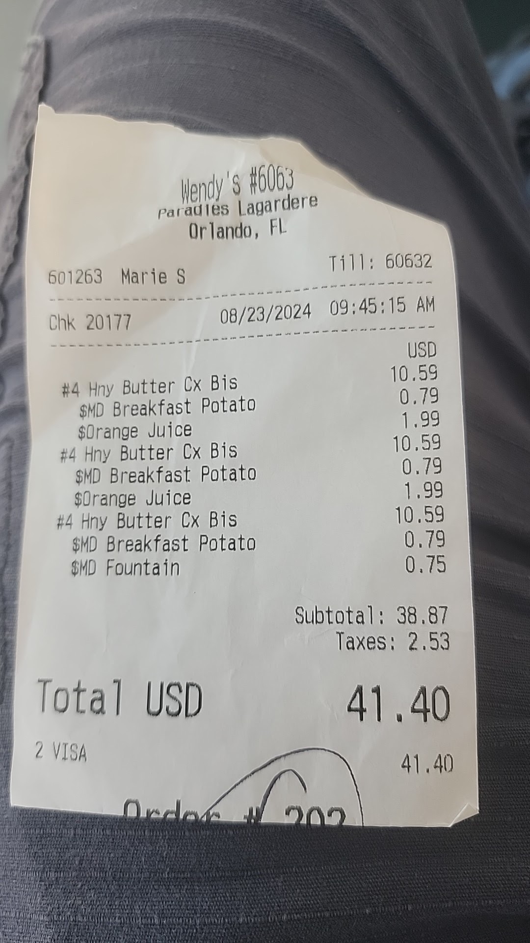 The food was fresh, and the crew was friendly, but be ready to be overcharged w/o your consent. My kids and I got a breakfast combo that was listed on the sign as $10.69, expensive but not outrageous as airport prices go. Then we were charged an ADDITIONAL $1.99 each to change 2 of our drinks to orange juice (somewhat understandable but still weren't informed). But the real kicker was, they charged my son an extra $.75 for getting a fountain drink, and all three of us an extra $.79 each for "MD Breakfast Potato". I guess the drink and potato are not included in the upcharge from a $6.99 sandwich to a $10.79 combo, despite clearly being pictured in the combo sign? So it is literally anywhere from $6 to $8 for your drink and potato wedges. As a loyal Wendy's customer for 40+ years, it is incredibly disappointing to be blatantly robbed by a company I hold in high esteem, at least as far as fast food goes. I will never patronize the Orlando Airport Wendy's again. At least the Wendy's near my...