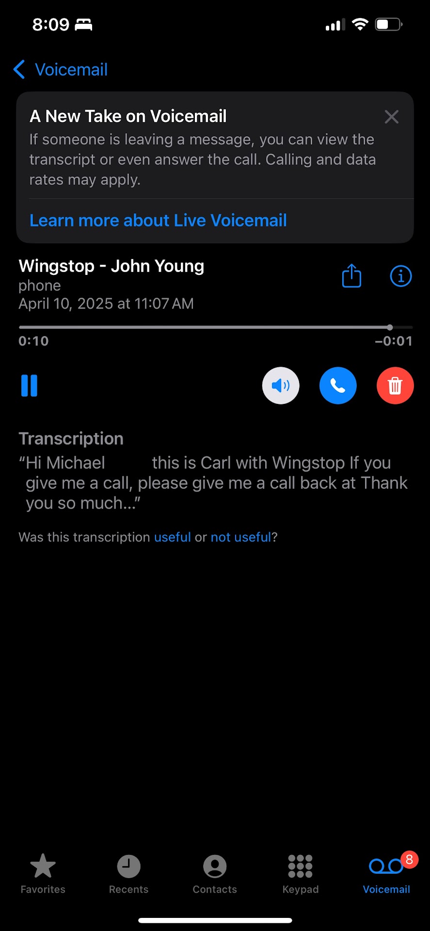 At 11:01, I received text message confirmation of the time my order would be delivered. At 11:07, the manager (Carl) at the John Young Wingstop Location in Orlando, Florida called me and stated that half of the order was left at the store (not placed in the bag).