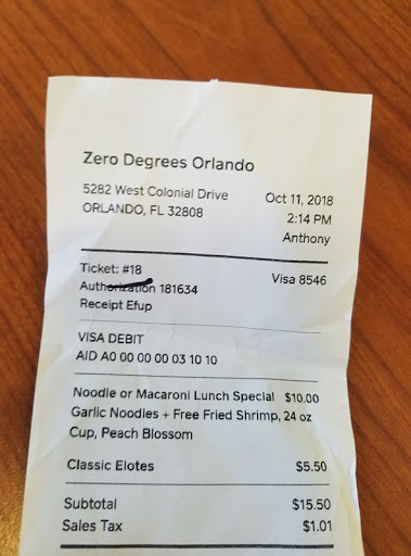 Read moreThis was my first experience with this place and I let the gentleman behind the counter know it. He was not very helpful in making my choice as he offered no suggestions, nor asked me if I had any food allergies or explained the nature of the cuisine. I ended up choosing the Garlic noodles with Shrimp lunch with Peach Blossom tea and added an appetizer of a Classic Elotes. After 30 minutes of waiting for my food I asked why was it taking so long and the gentleman said he would check where it is, 5 minutes later they brought out my food. I informed the woman who appeared to be the manager that I had lost 35 minutes of my lunch hour waiting for my food, her response was "the food takes time to cook." I had to get back to work so I did not rebuttal. The food that I had to eat in my car in 5 minutes before I had to walk into the office: The garlic noodles were dry with no sauce, the shrimp still have their heads on and even though it does not bother me ordinarily I would not have picked it as I do not want to smell like garlic shrimp after peeling. The shrimp were dry (explains why my meal took so long). I have visited Mexico 5 times on different cruises and have had a passion for Elotes for a long time. My appetizer: (which can now be considered a side) these were straight jolly green giant nibblets from the can with a micro-dermal thin layer of pulverized cheese and no sauce... please do not call this Elote Zero Degrees, it is a disgrace. Paltry food and disgusting service all for the wonderful price of $16.51... I do not recommend this and advise to stay away... PS the peach blossom...