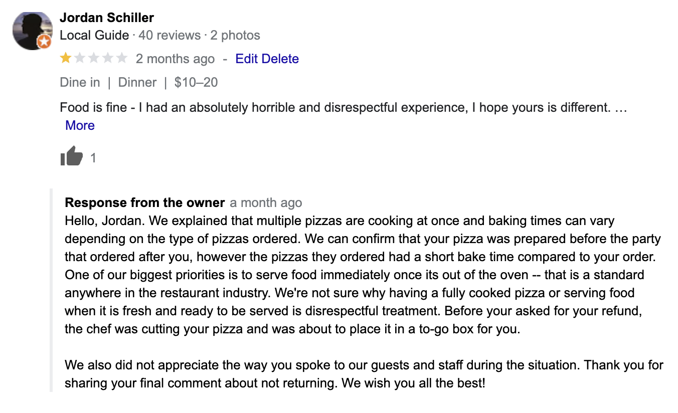 Thank you for taking the time to respond to my review. I appreciate the explanation regarding the baking times and the effort to serve fresh food immediately from the oven. However, I believe there are important aspects of my experience that need addressing.