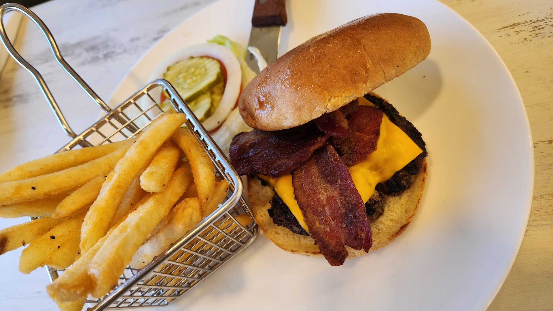Well, my husband's bread and burger were both burnt. Same as last time, he specifically tells the server any type of cheese but not AMERICAN!!! I don't know what he has against American cheese, I don't like any type of cheese
