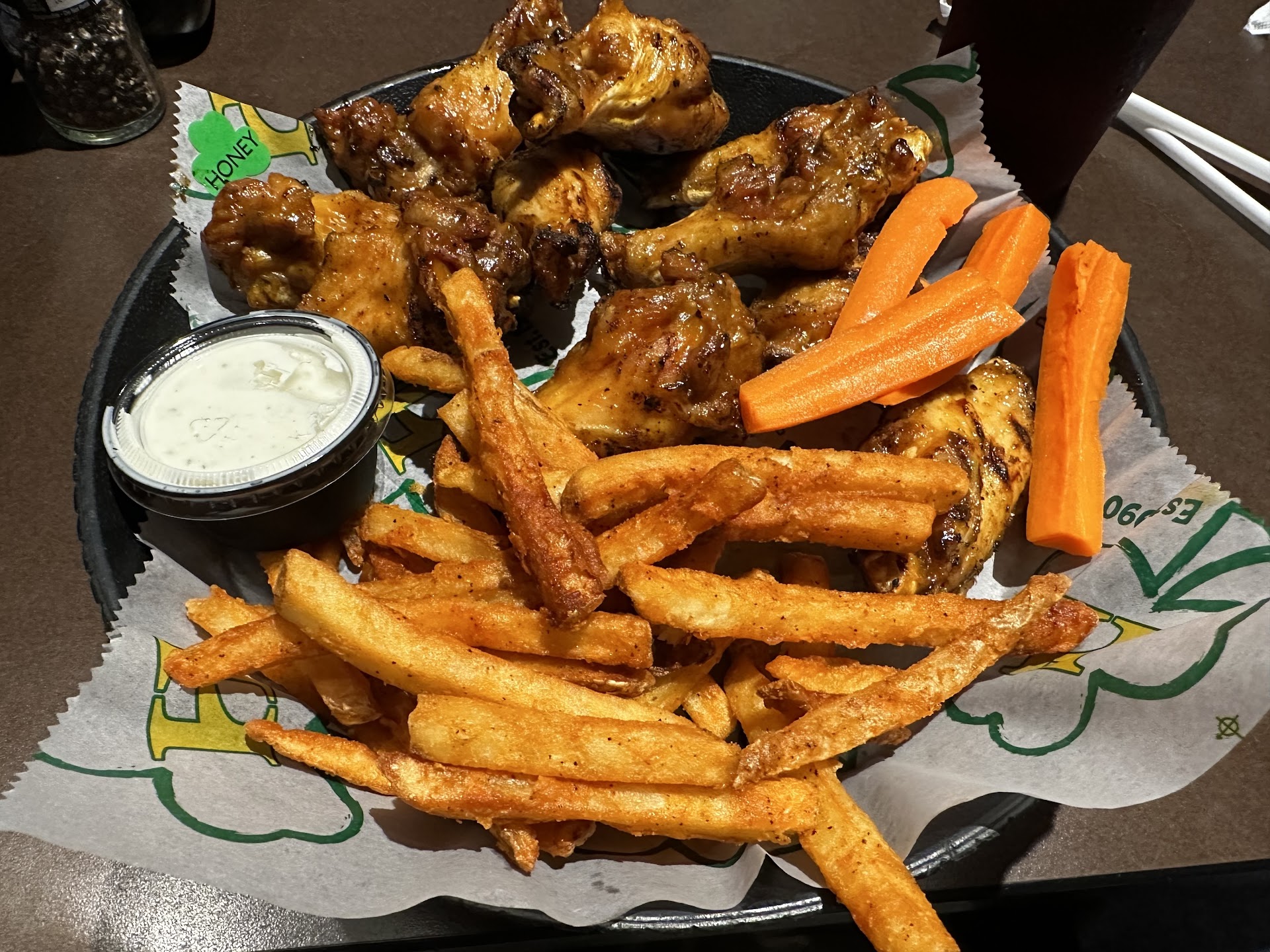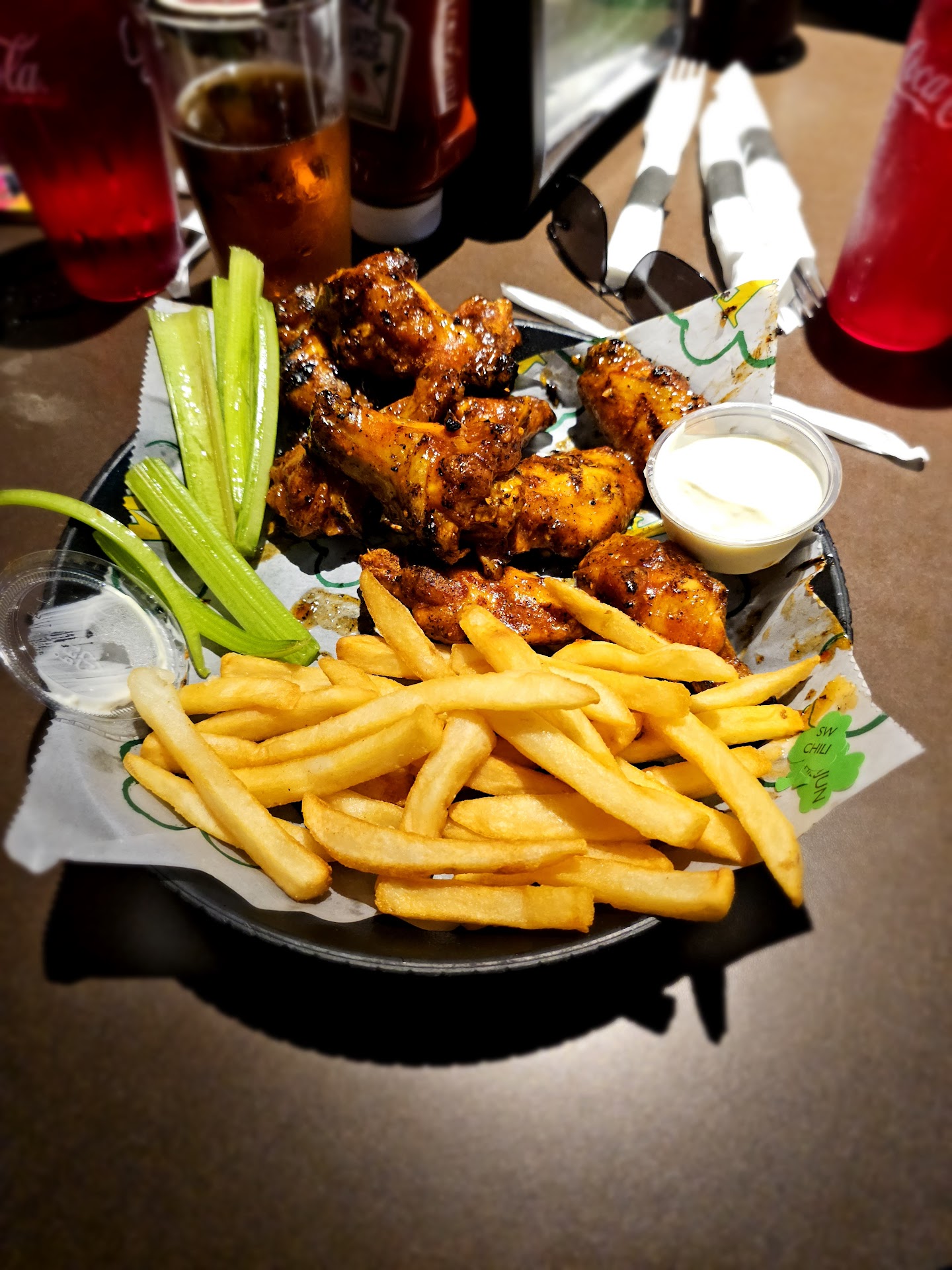 I ordered 10 medium Wally Wings, wet. The person I was with ordered 10 mild traditional wings with seasoned fries. I usually don't get wings here. When our food was brought out, we were given the wrong plates. Because of that, I believed I had received mild wally wings with seasoned fries instead of medium wally wings with no fries.