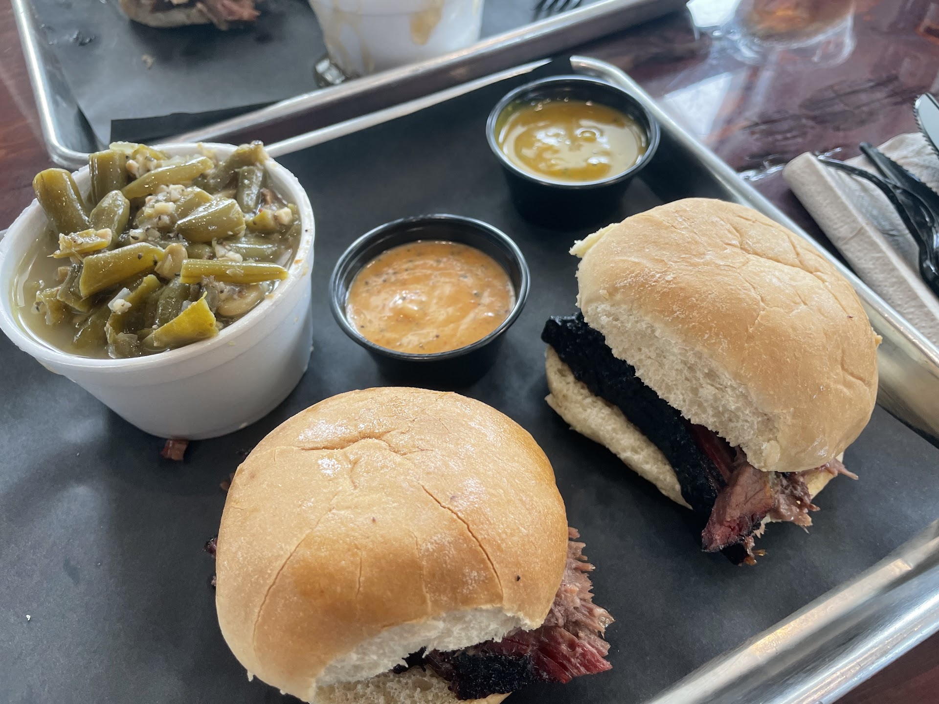 Read moreWent there today for a birthday lunch because I was craving some good bbq. It was overly crowded so we asked for it to go. On their menu it says a list of meat then “sandwich, entree or dinner” in which there is no difference between the sandwich or entree. They both give you two sides so I assumed you’d get two sides like fries and Mac n cheese. No, a drink is considered a side so realistically you get one side and a drink unless you want two actual sides and add a drink for extra money. We sat outside while we waited for our food and noticed the guy who was cutting the brisket walk in and out of the building with the same gloves on. I went back in to refill my drink and there was grease all over the handle. I hope to god that he changed his gloves before touching anymore food. While waiting I ended up going back in to get fries because originally I wanted two sides, not one side and a drink. I ended up getting fries and their pasta salad. We got home with the pulled pork sandwich, and the grilled c’s.. both sandwiches were extremely dry, I felt like I was chewing forever. It reminded me of my mothers over cooked pork tenderloins. I have no clue what the name of the sauces I got were because the sharpie they used has rubbed off. The “sweet” sauce tasted like a sweeter version of a1 sauce. The yellow sauce looked like it would be good but it tasted like watered down honey mustard with a strong taste of yellow mustard. The orange-ish sauce tasted like an overly spiced version of the blooming onion sauce from outback. The Mac n cheese wasn’t all that great, baked beans looked decent but was absolutely horrible and I’m 90% sure they used the wrong beans. Pretty sure they were kidney beans. The pasta salad was waaayyy overly spiced I literally ate one noodle and tossed the rest. I definitely believe they’re asking too much money for the quality of food they’re trying to sell. Also, if you plan on eating outside, make sure to bring bug spray because they are everywhere out there!