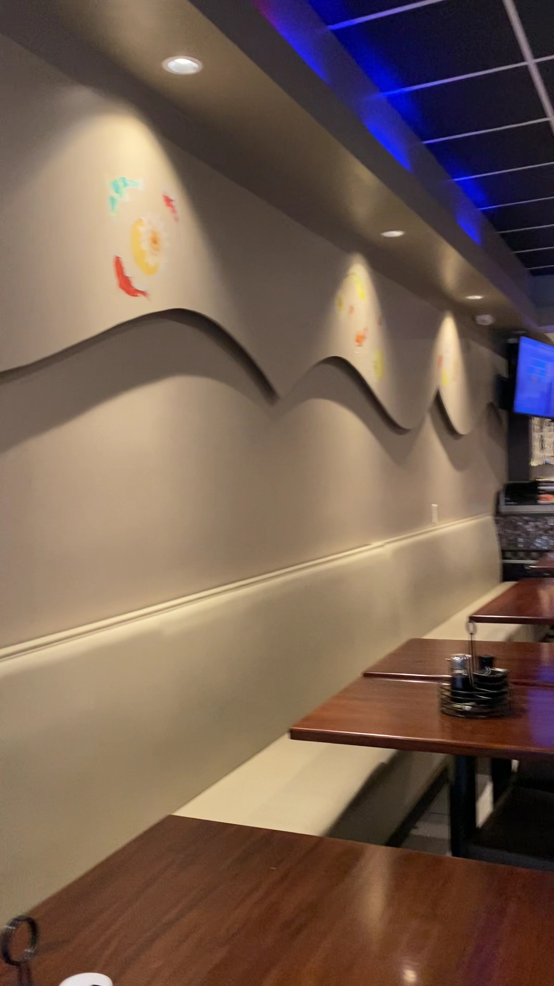 The restaurant was clean; our server was efficient and capable; the staff was nice enough to accommodate our tempura request; the bathroom was clean. The background music was current Chinese pop hits. My husband liked the candies in the bowl at the front. Nice koi mural...