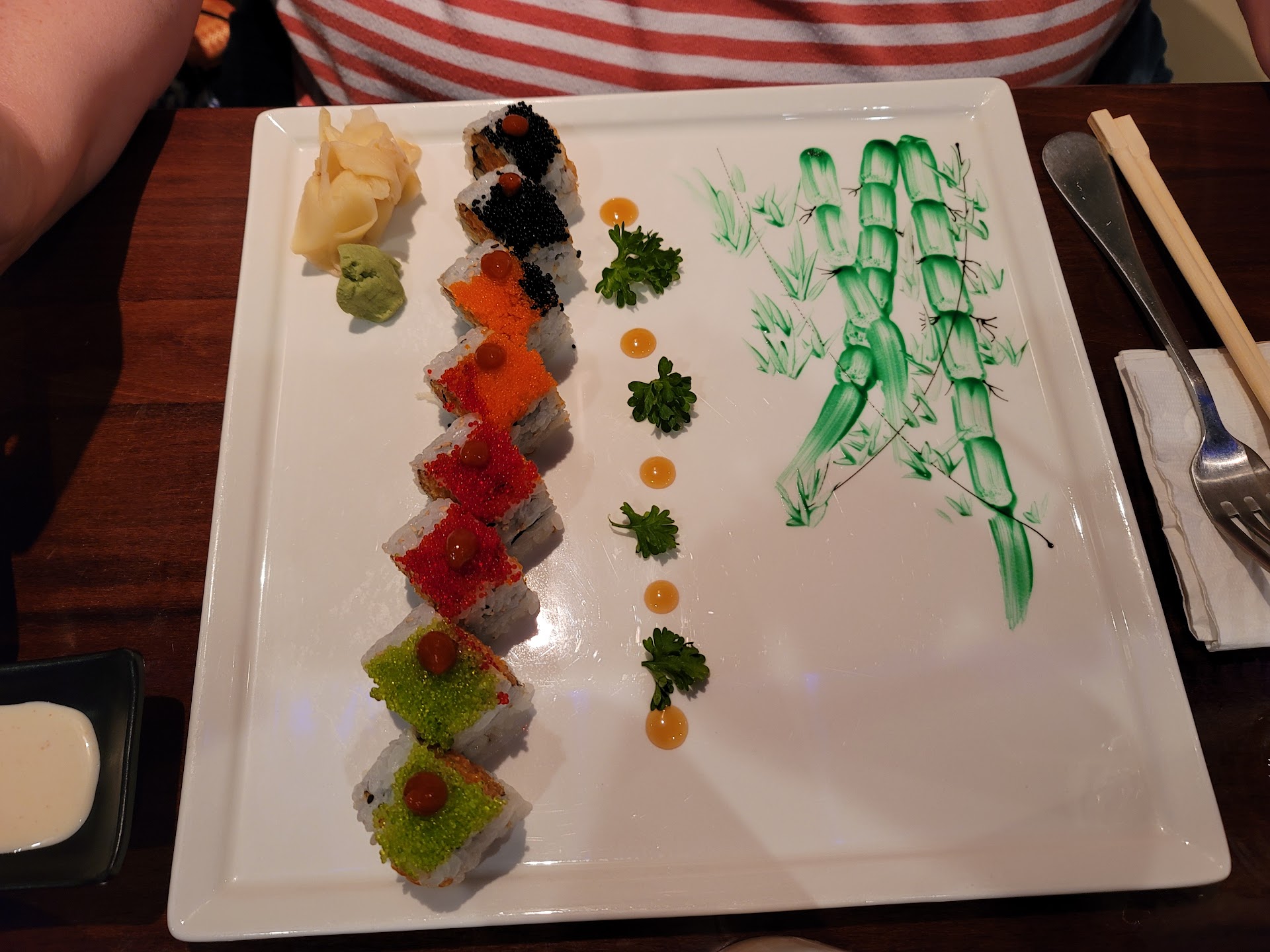 They specially made a mixed shrimp and vegetable tempura appetizer for us even though tempura isn’t on the menu, because they do make tempura for the sushi. The tempura was tough in some spots (excess batter, and the batter recipe was heavy); the hibachi chicken and noodles were bland; the katsu sauce was salty and dark (it’s supposed to be sweet and tangy); the white mayo sauce “for the tempura” was like Pollo Tropical’s garlic sauce but was made with visible garlic powder and Miracle Whip or a sweet mayonnaise thinned out; and the lunch special soup was clear soup, not miso soup.