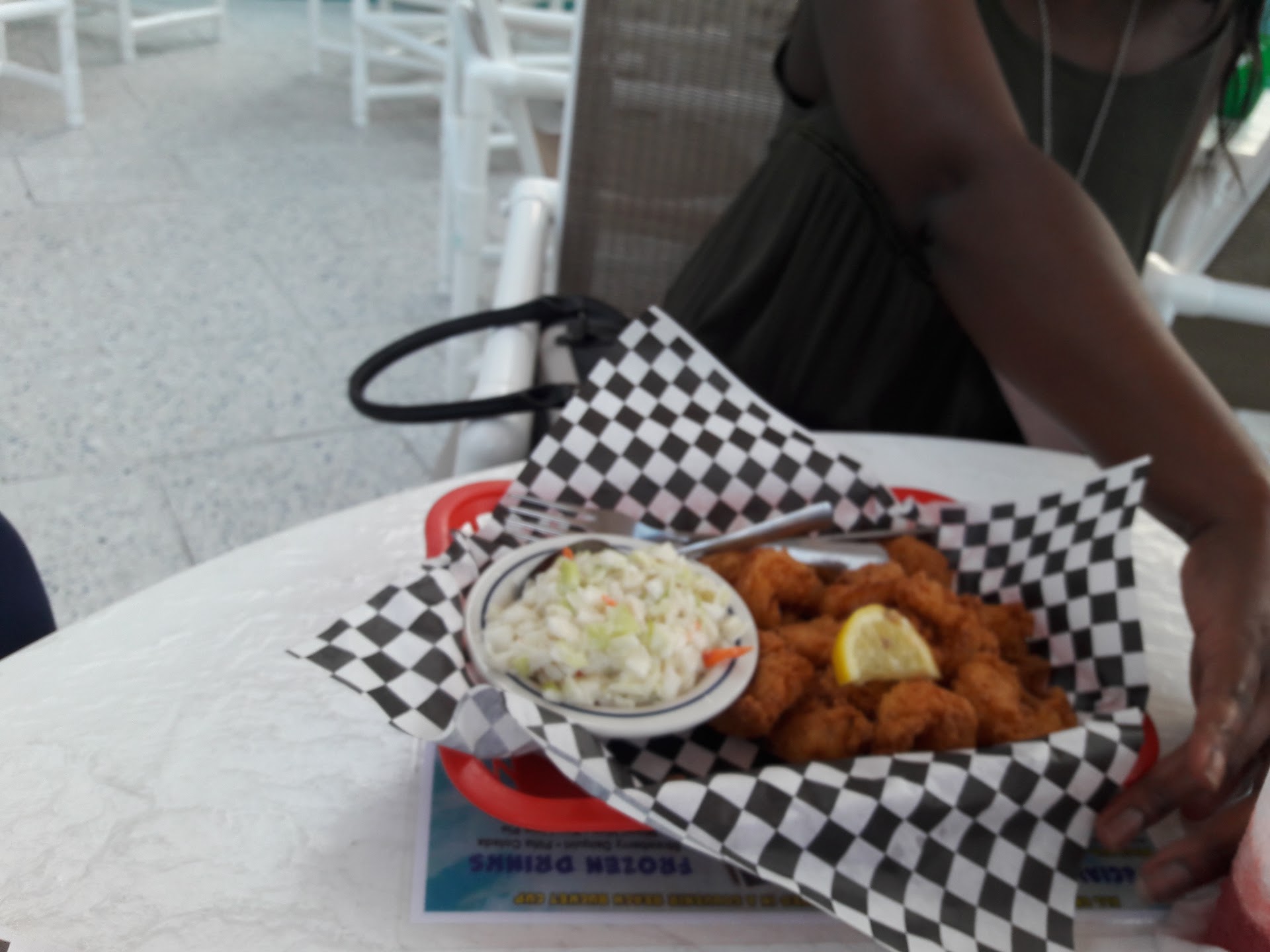 The menu selection included various deep-fried appetizers, fish sandwiches, po-boys, breaded shrimp basket, fish tacos, burgers, etc. I ordered the shrimp basket w/ seasoned fries. The serving portion was generous with medium shrimp that was not overly battered. It was decent, but not particularly interesting or unique. The food was moderately priced. Our visit took place during an afternoon lull.. smack-dab between lunch and dinner. Despite having plenty of wait-staff on hand, we waited about 35 minutes for our entrees to arrive. With its terrific location and ocean-view, the Beach Bucket could be something special, and maybe even spectacular. Instead, it aspires to little beyond...