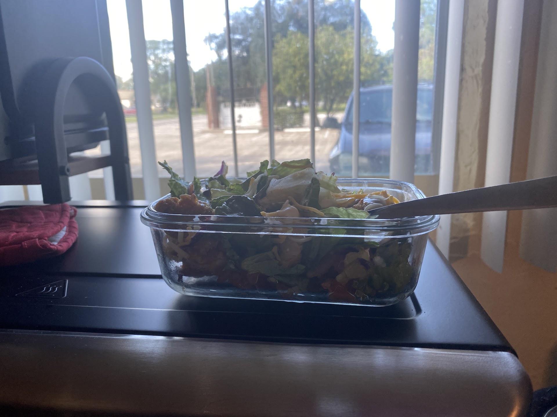 BEWARE ROTTEN MOLDY FOOD!!! Corporate needs to show up and clean house. I ordered a house salad with grilled chicken and no fried onions. I asked if the carrots and purple cabbage was optional and was told it comes in the salad mix. When I opened the salad I immediately noticed the salad looked black on most of the lettuce and wet like it had been sitting in water. I proceed to pick out as much as I could off the carrots and cabbage but now I’m also picking out the nasty black and brown wet lettuce pieces as well. I then found a big nasty moldy chunk of the lettuce core in the salad along with a brown rotten piece of the core see photos. I’m on my lunch break and now I have a salad that I’m afraid to eat. I will not dine here again, this is completely unacceptable. And I really want my money back. All the food places in the area I could’ve chose and I wasted my lunch break picking up a wet, rotten soggy salad. Also the worker taking my order from the intercom did not taking than listening and cut me off as I was trying to speak and had to repeat that I wanted grilled chicken because he wasn’t listening...
