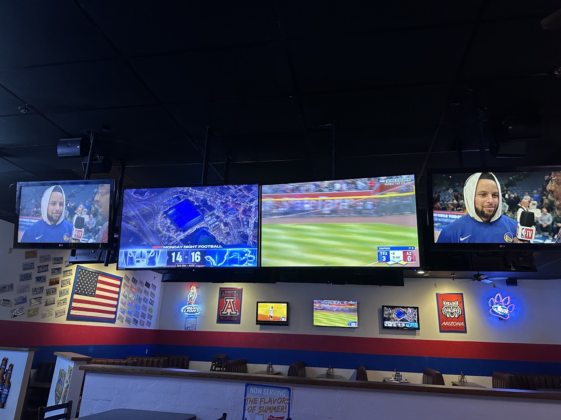 Busy, and surprisingly big inside too. Lots of tables and booths, mostly occupied when we were there at 7 on Tuesday evening. Big screen TVs turned on everywhere they could be hung, showing many different sports events at once.