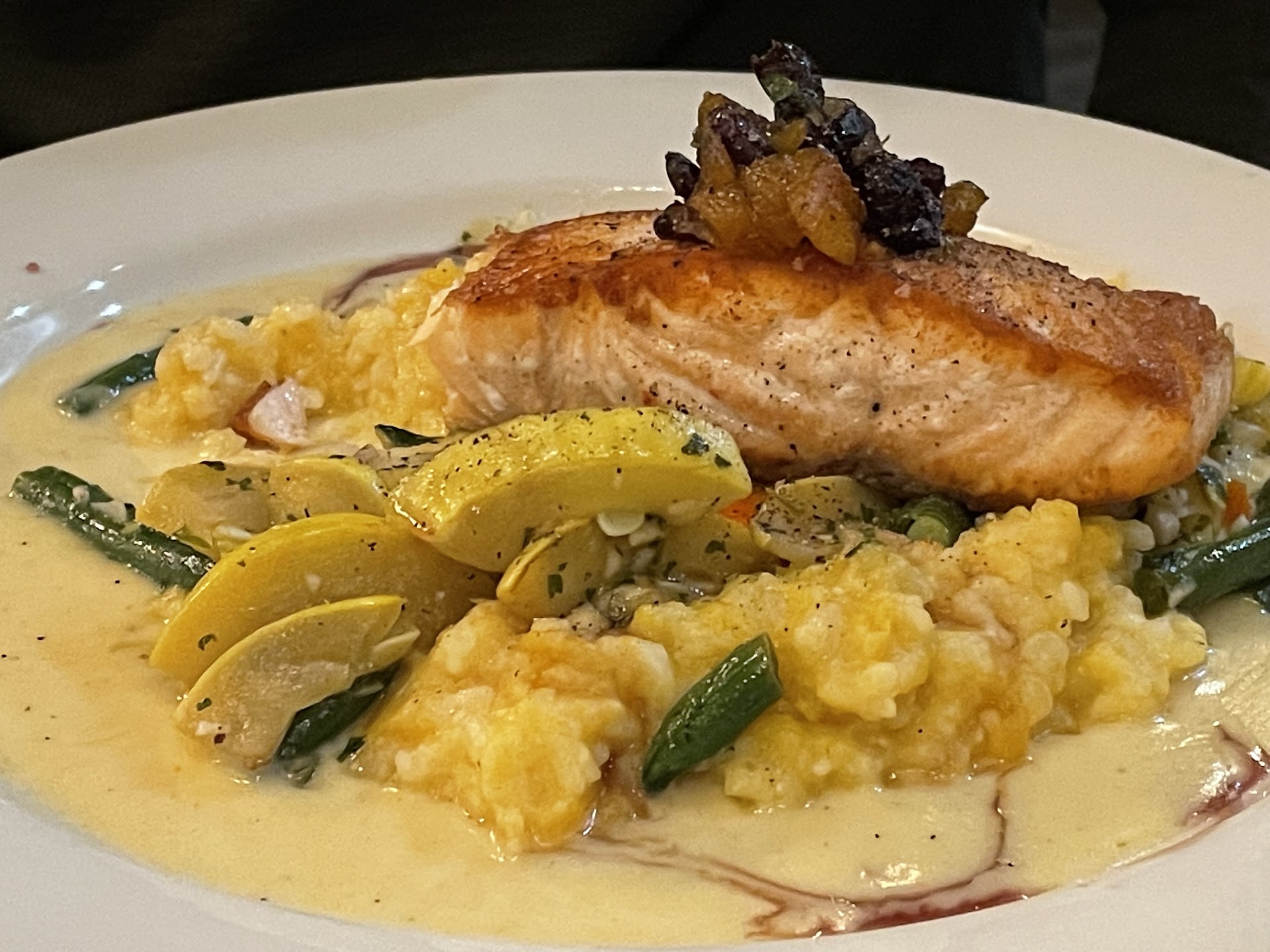 The Blueberry Moonshine Lemonade was great and surprisingly refreshing! The warm brie with garlic and fruit chutneys was amazing and the flavors just meshed so well! The short rib tacos hit the spot, and just when I was afraid I wasn't going to have any room for the main course, Chelsea brought out the complementary warm baguette and cherry butter. Thank the food gods I had fasted in preparation for this gastronomic event and that this place knew how to pace a meal. After a quick food break, I was more than ready when they brought out the filet medallions and the salmon main courses.