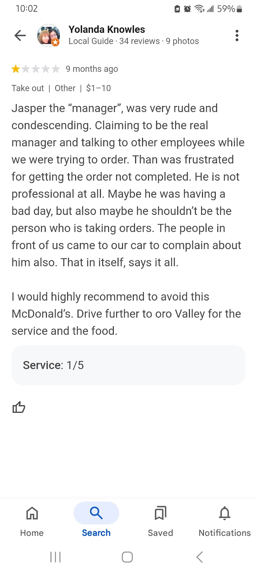 Read moreI have been a customer at this McDonalds location for over 10 years. I have NEVER been treated the way I was treated today. I was having issues with the kiosk and I ordered 2 extra sandwiches and a small drink instead of a large by mistake. I stood at the counter for 10 minutes while a guy Jasper, who I found out later was the manager, completely ignored me. He walked over to the register area to put my order up and STILL did not acknowledge me standing at the register. I had to say excuse me 3 times to get his attention and when he finally came over I let him know that I had been standing there for a while and was trying to tell him not to make the extra 2 sandwiches because I ordered it by mistake and he said " Well I'm the one here" which he wasn't, and had a bad attitude. I showed him my receipt and let him know I got confused and he said rudely" well you got 4 sandwiches". He walked to where my order was and took out the other 2 sandwiches and asked me for my credit card to refund me. He started to walk away and I let him know I ordered a small instead of a large drink and he turned his back to me and mumbled under his breath " well that's not what you were charged for". I told him never mind because his attitude was horrible. I got to my car and realized any size drink was $1.29 so I hadn't been charged incorrectly. I realized how unprofessional, rude and dismissive he was to me and decided to call and let him know how he treated me. He answered the phone and when I asked to speak to the manager he said "I am the Jasper the manager. I let him know that all drinks any size was a $1.29 and that I didn't appreciate him walking away from me a and mumbling under his breath making it seem like I was trying to get something I hadn't paid for. He rudley told my if I wanted to complain that I can complain to someone else and hung up on me. I sat there for a minute in my car and decided to go bac in and get the large drink that I wanted. I approached the counter once again and was ignored until I yelled "excuse me can I get my large drink" I was trying to tell him that I didnt appreciate him hanging up on me and he just walked away and got my drink. He placed the drink on the counter, rolled his eyes and turned his back without not acknowledging how he made me feel or apologize. He was the most unprofessional and rudest person I have ever encountered at this location. He shouldn't be working there let alone be the manager if he can't be kind. He doesn't know who I am and I could've been the CEO of the company for all he knows. Reading through the comments, there is another complaint about him. It seems like Jasper needs more training on how to be professional or he shouldn't...
