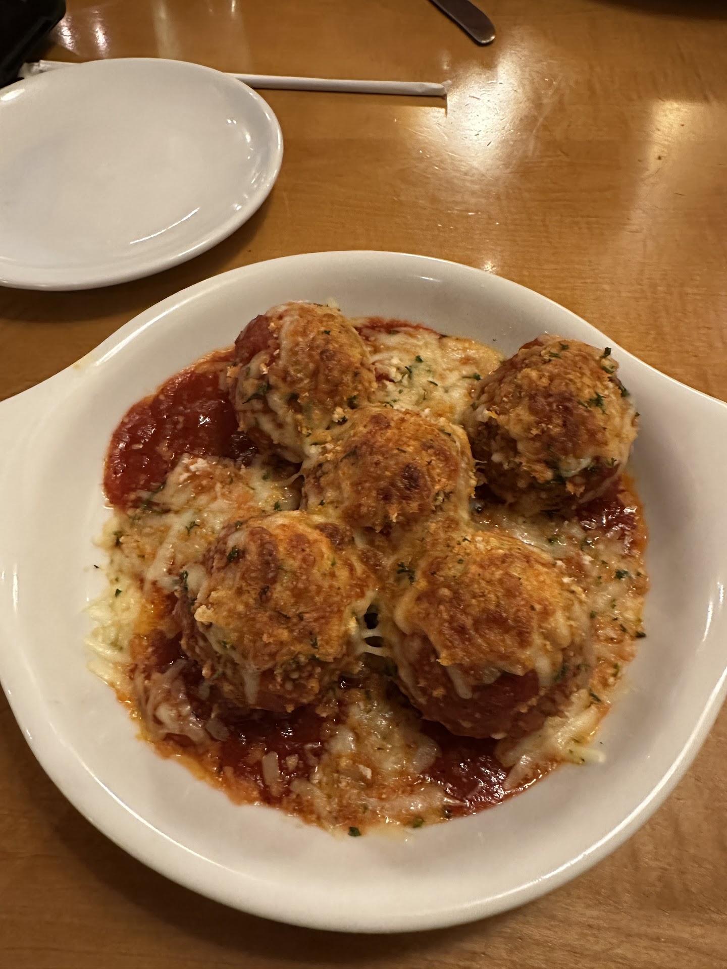 Everything else was great. The atmosphere was good, people friendly, the room was bright and cheery, and our waitress was personable and helpful, and she didnât even scowl (as some other restaurants do) when we only ordered the smaller lunch portions. My wifeâs chicken parmesan was good for her, except that it was covered in chopped tomatoes instead of marinera sauce â not bad, you just need to be aware of this when ordering. Our friendsâ lasagna, lunch sized, was tasty and he enjoyed it, properly crusted and it has both ground beef and sausage. I ordered a side order of meatballs, and a side order of sausage, and asked them to exchange marinera sauce for Bolognese (meat sauce), and they were happy to do that. When it came, the meatballs, as usual were nice size and hot inside. The two sausages however, were just barely warm on the insides, and mushy to boot. I could only eat one of them and left the other. Now the meat sauce was excellent. I realize these meatballs and sausages are âpre-cookedâ, which is smart, and then warmed up, but these felt like they had not been fully cooked and then not warmed up enough.