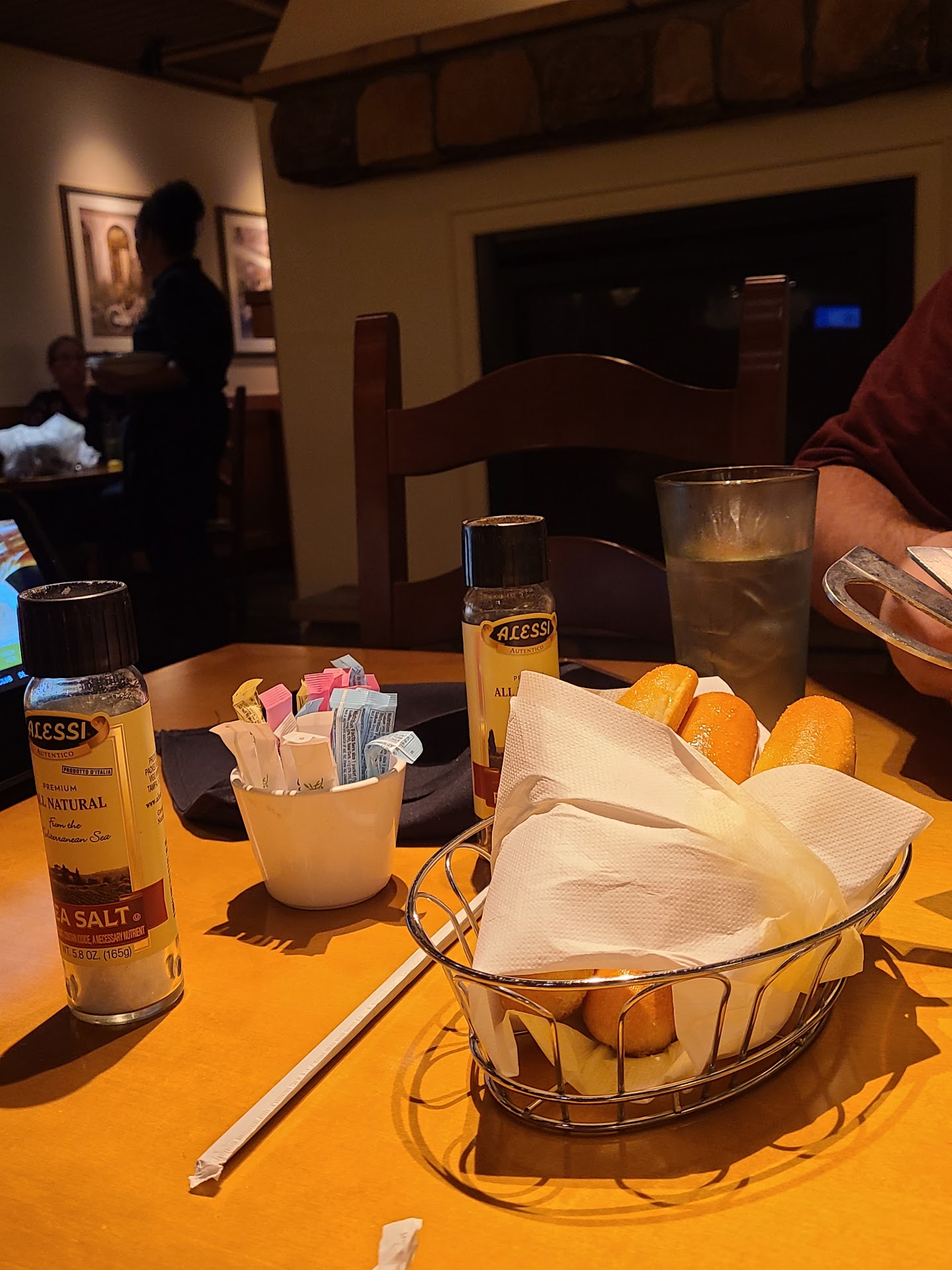 Read moreCame in on a Friday evening. We were promptly seated in a young womanâs section. She was bright and friendly, we could tell it was busy so we were thrilled she stopped by right away. We ordered our drinks and an appetizer and asked for a bit longer to peruse the menu (as if we werenât going to order the same things we always do). She comes back after a bit and we place our order. At this point we have run out of breadsticks, but no need to fret weâre sure sheâll refill those when our soups come out. After about 10 minutes or so we are out of beverages, but our soup has arrived. No breadsticks though. She asks if we want cheese for the soup, we donât. She leaves before we can ask for refills on drinks. We didn't see her for 10 mins so we couldnât flag her down. She comes around and buses a few dishes from a dirty table but doesnât so much as glance our way. Weâre thirsty. We order waters on the little kiosk. 15 more mins, she comes back to tell us the kitchen is backed up and asks if we need anything and we ask for the water. 20 mins more. No water, no young lady, no food. We get up to leave and the lovely gals at the host stand jump into action to grab their manager. I explain Iâm happy to pay for the full meal since they can box it up. He offers to comp it in full which is greatly appreciated. Iâve never been one to complain about service on a busy night, I used to work front of house so I understand things happen when your section is packed but we learned we were her only table after speaking with the manager. Iâm not sure we will be back, maybe in a couple of months weâll give it another go. (I was nervous after making the complaint and spilt our to-go water all over the table- so sorry to the waitress that cleaned that...